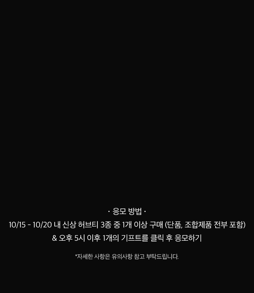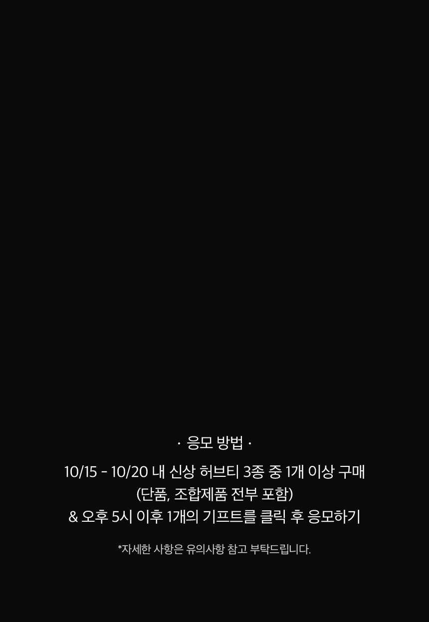 응모 방법 : 10월 15일부터 10월 20일 이내 신상 허브티 3종 중 1개 이상 구매 (단품, 조합제품 전부 포함) & 오후 5시 이후 1개의 기프트를 클릭 후 응모하기