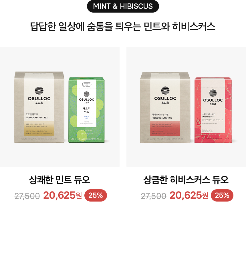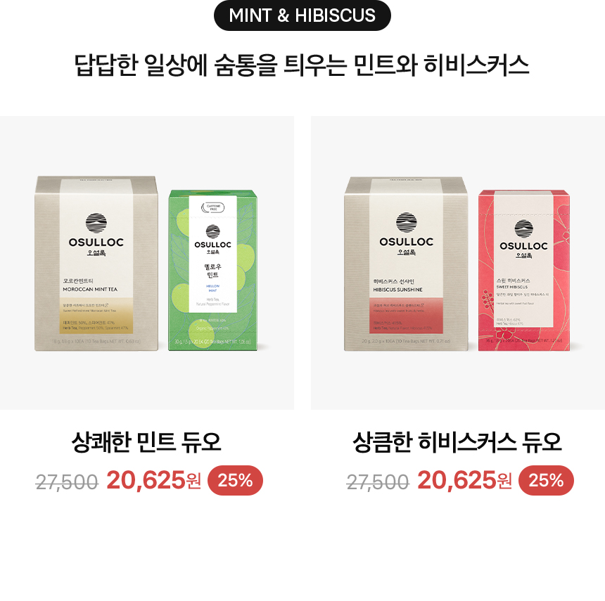 상쾌한 민트 듀오 자세히 보기상큼한 히비스커스 듀오 : 정상가 27500원, 오후 5시 특별가 25% 할인 20625원