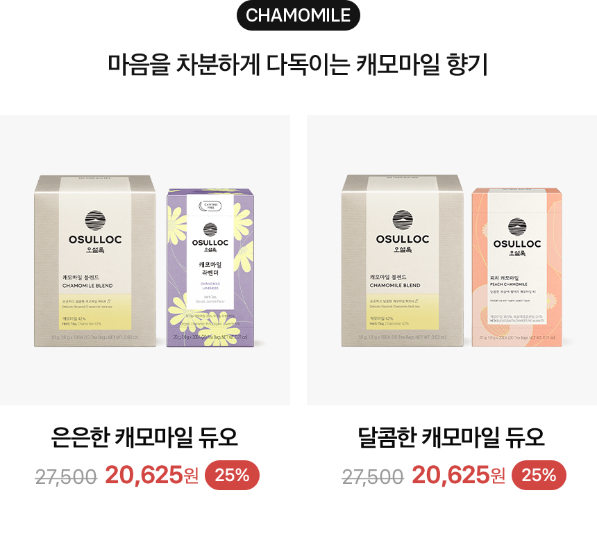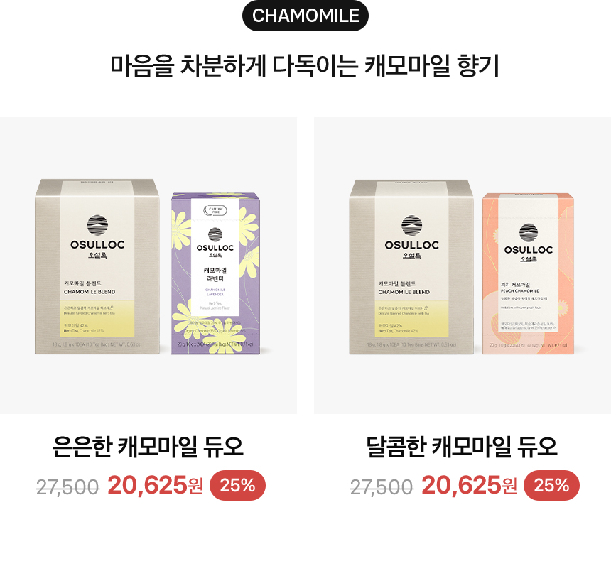은은한 캐모마일 듀오 자세히 보기달콤한 캐모마일 듀오 : 정상가 27500원, 오후 5시 특별가 25% 할인 20625원