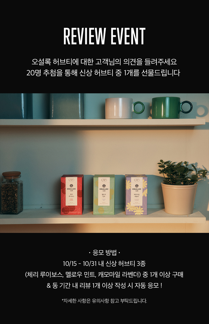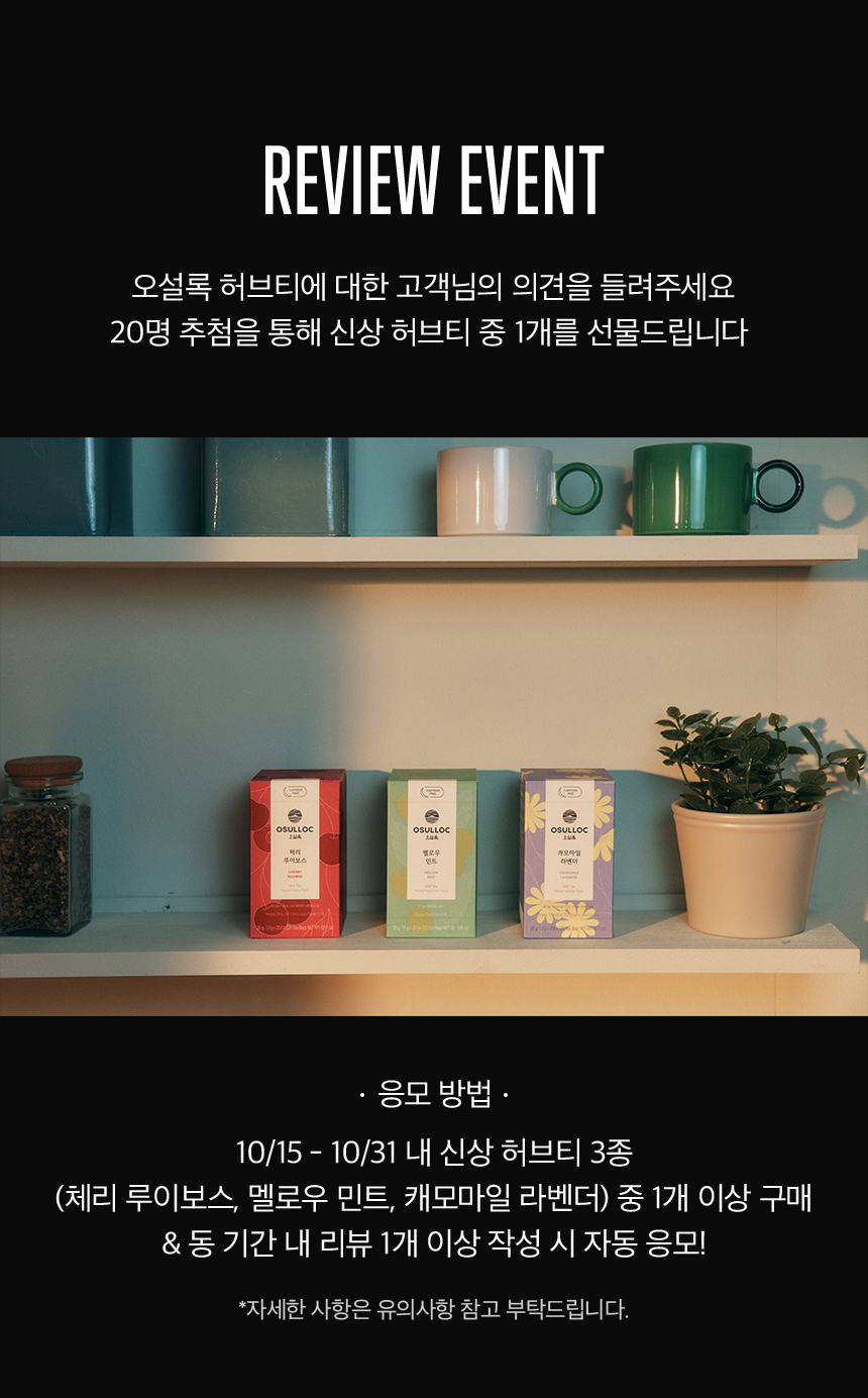 응모 방법 : 10월 15일부터 10월 31일 내 신상 허브티 3종(체리 루이보스, 멜로우 민트, 캐모마일 라벤더) 중 1개 이상 구매