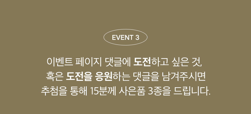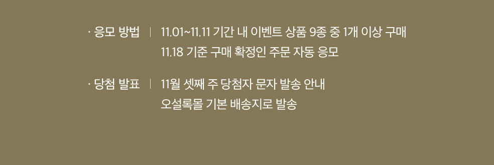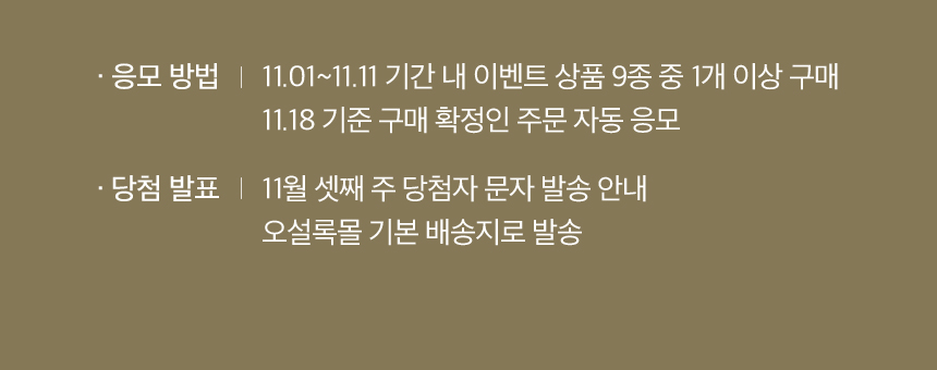 응모 방법 : 11월 1일부터 11월 11일까지 기간 내 이벤트 상품 9종 중 1개 이상 구매, 11월 18일 기준 구매 확정인 주문 자동 응모