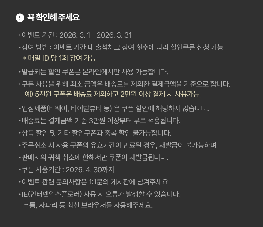 - 입점제품(티웨어, 바이탈뷰티 등)은 쿠폰 할인에 해당하지 않습니다.