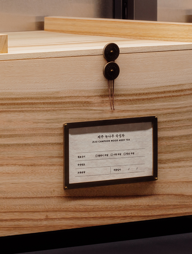 숙성차들은 ‘숙성차 보관함’이라 불리는 나무함에 담겨 일정 기간 숙성됩니다. 그리고 제주 삼나무 숙성실, 제주 녹나무 숙성실, 오크 배럴 숙성실 이렇게 세 가지로 나뉜 숙성실에서 보관되죠.