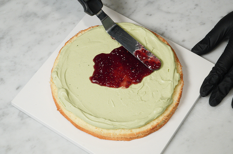 말차 크림 위에 라즈베리 잼을 얇고 고르게 펴 발라