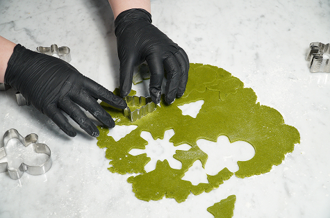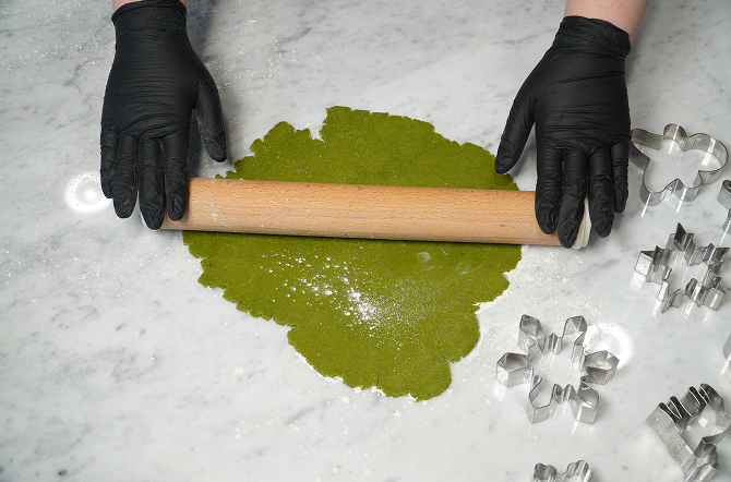 볼에 말랑한 버터를 부드럽게 풀고, 노른자, 우유, 쿠키 믹스, 그리고 말차 가루를 넣어 가루가 날리지 않을 때까지 뭉쳐줍니다. 완성된 반죽을 밀대로 밀어 0.5cm 두께로 균일하게 폅니다.