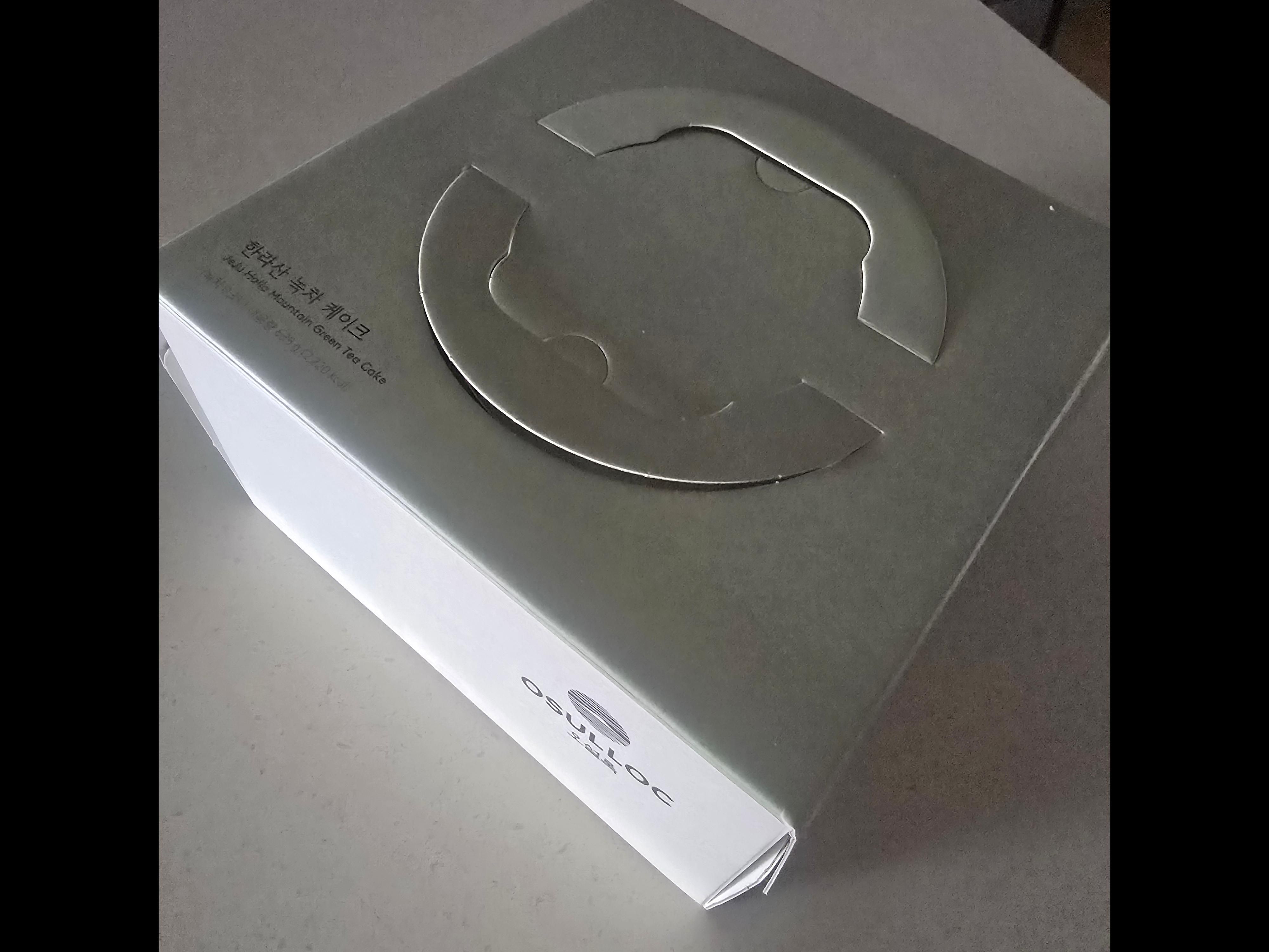 오설록 제주 한라산 녹차 케이크는 가로 210mm, 세로 210mm, 높이 140mm의 종이 상자로 포장되어 있습니다.