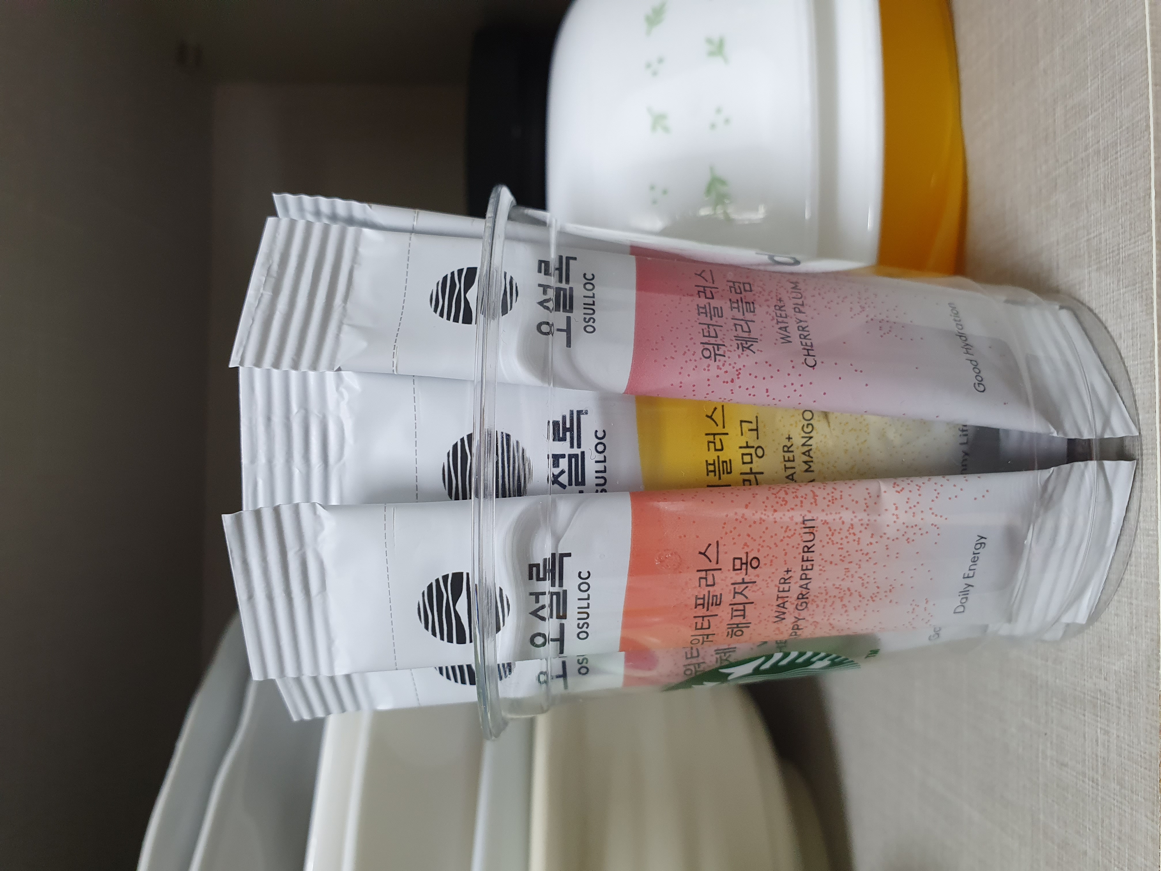 워터플러스 시리즈에 반한 1인입니다. 제가 마실 용도여서 버라이어티팩으로 선택했습니다. 팩 구성은 세가지 맛을 골라마실 수 있어 좋습니다. ♤맛♤ 저만의 기준으로 우선 순위는 깔라망고>해피자몽>체리플럼입니다.(참고로 저는 과일을 좋아하고 신 음식도 잘 먹는 사람입니다) 각각 조금씩 다른 재료들이 섞여있지만 이름에 있는 깔라만시. 자몽. 체리맛이 조금 더 느껴집니다. 이름만 들으면 침이 고이는데 신 맛보다는 달달한 맛도 있어서 누구나 거부감 없이 마실 수 있을 것 같아요. 미지근한 물보다 시원하게 마실 때 훨씬 맛있습니다. ♤먹는 방법♤ 물 500리터에 1포를 섞은 후 절반쯤 마실 때 물을 더 채우는 방식으로 마셔봤는데 연하지만 괜찮은 맛으로 끝까지 마시고 있습니다. 뚜껑있는 보틀을 이용할 경우 100리터에 분말을 풀어 준 후 나머지 400리터를 채워서 섞는 방법이 가장 잘 풀어집니다. 그리고 홈페이지에 안내된 팁대로 얼음으로 만든 후 탄산수를 넣고 에이드로도 만들어 먹어봤습니다. 얼음 한 판 만들어 두고 뿌듯합니다. 각각의 본연의 맛을 느껴보고 싶다면 물에 섞어 마시는 것을 추천합니다. ♤나와 친지의 후기♤ 제가 마셔보고 마음에 들어서 친구에게도 나눠주고 회사 동료에게도 맛 보이고 추가 주문해서 부모님께도 보내드렸는데 세가지 맛 다 보시더니 부모님도 호평입니다. 원료에 포함된 피쉬콜라겐 덕분인지 체리플럼을 더 좋아합니다. 저는 평소 물이랑 안친해서 하루 1리터 마시기도 힘든편인데 구매 후부터 매일 1.5~2리터까지 물 섭취가 자연스러워졌습니다. 맛있게 물마시기 습관을 들이고 싶은 분께는 강력 추천하고싶습니다.