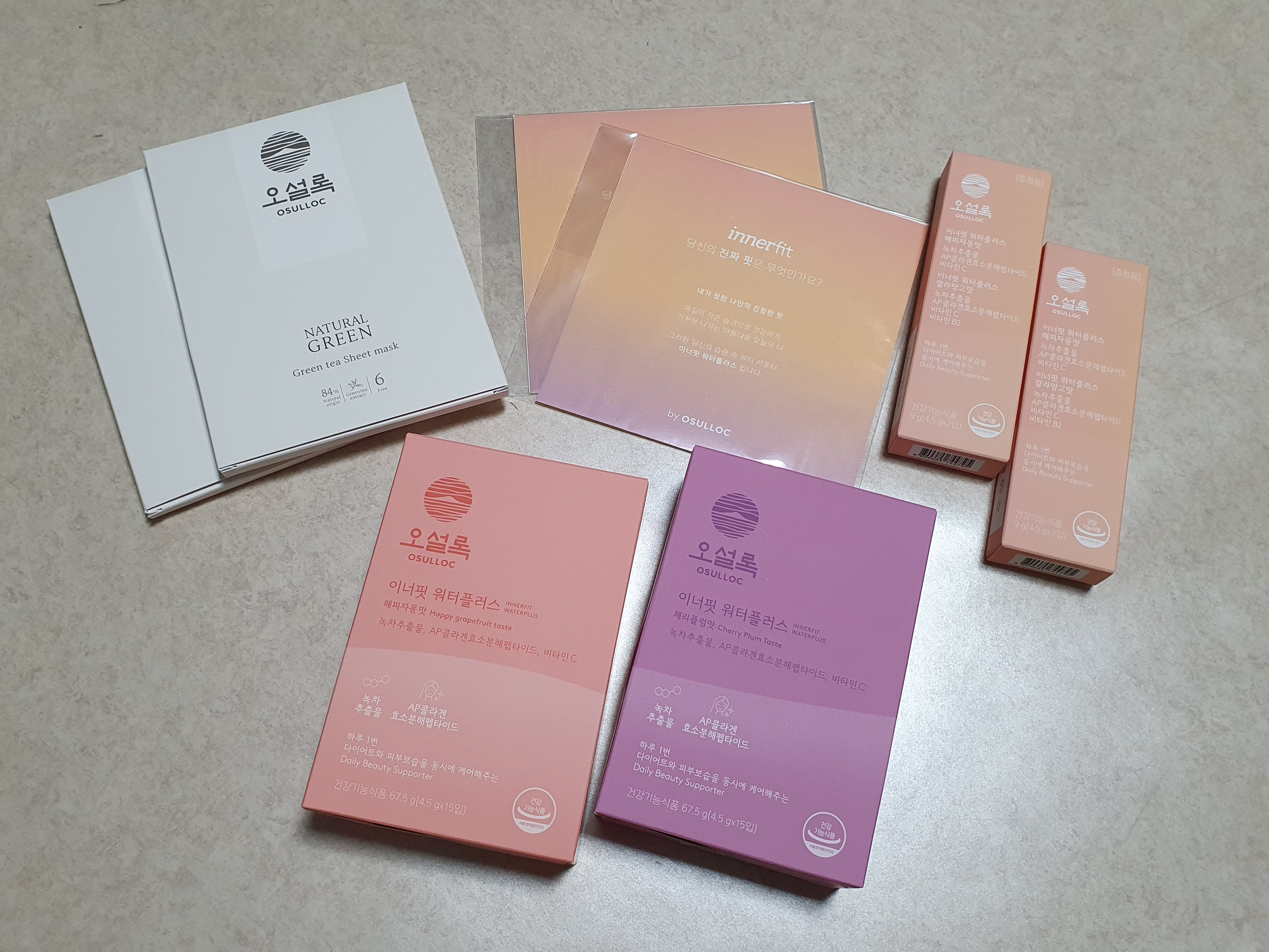이번에 맘 잡고 다이어트 하려고 구매해보았어요. 평소에 차를 좋아해서 제가 마시는 용으로도 주위 선물용으로도 오설록 차를 많이 구입하는데, 이번에 이너핏 워터플러스 제품이 새로나와서 구매했네요. 맛도 좋고, 카테킨과 콜라겐이 들어서 성분도 맘에들어요~~ 참, 출시기념 구매 이벤트로, 시트팩과 15일 스티커, 그리고 추가 4입까지 챙겨주어서 좋았어요 :)