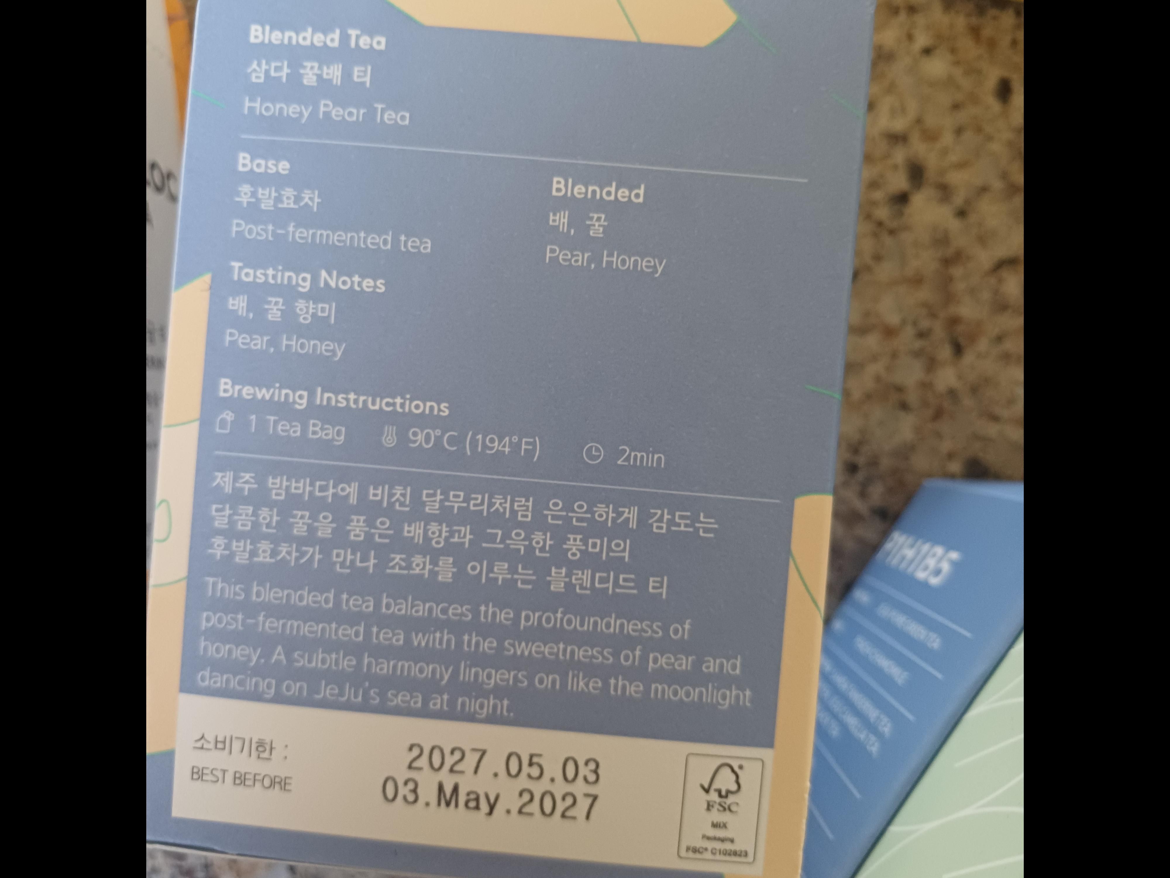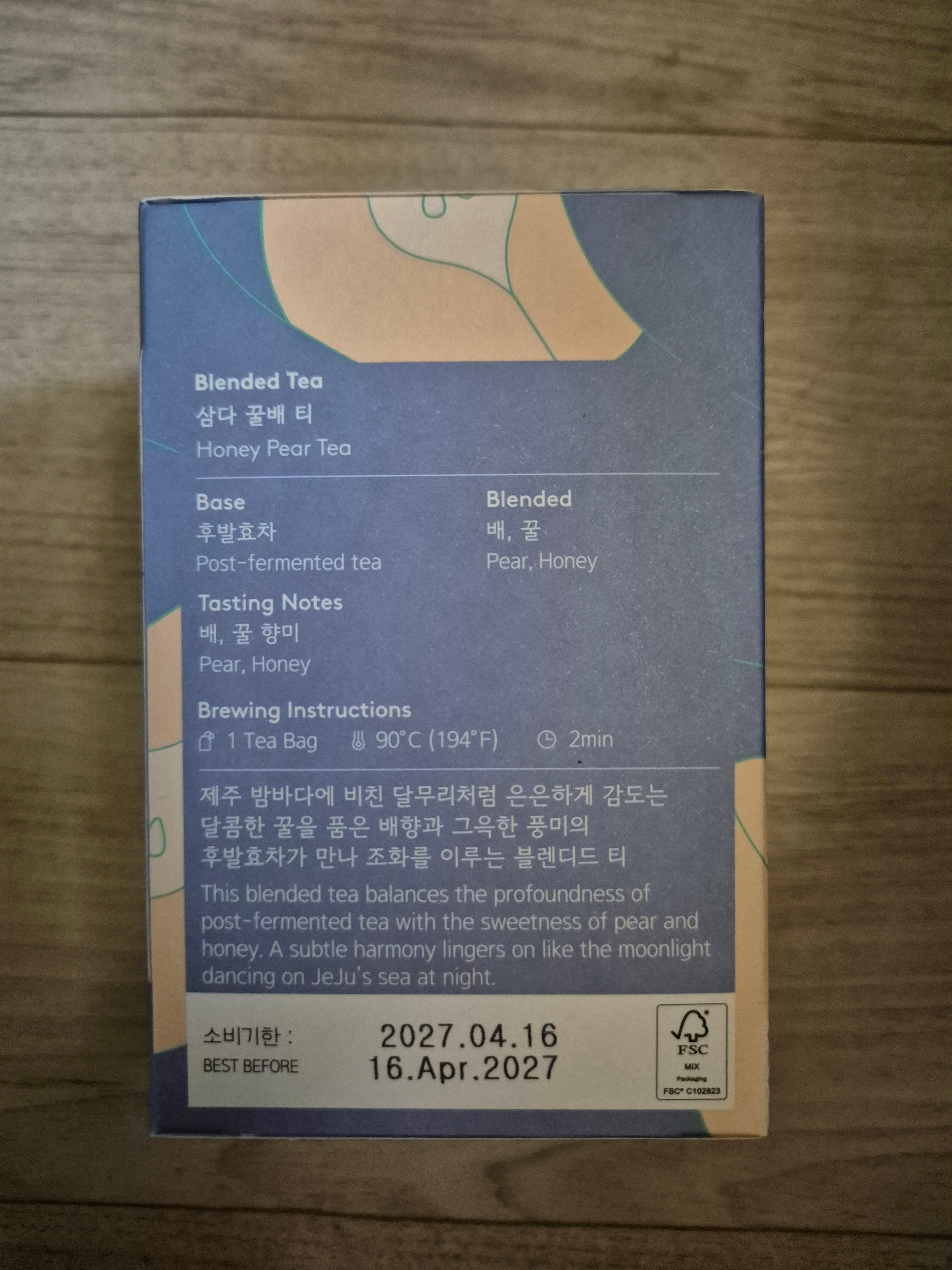 | 원재료명 및 함량 | 후발효차(제주산), 설탕, 배향향료제제(합성향료, 주정, 천연향료, 젖산, 프로필렌글리콜, 정제수), 꿀분말(꿀(국산)), 배농축혼합분말(배(국산)) | ||