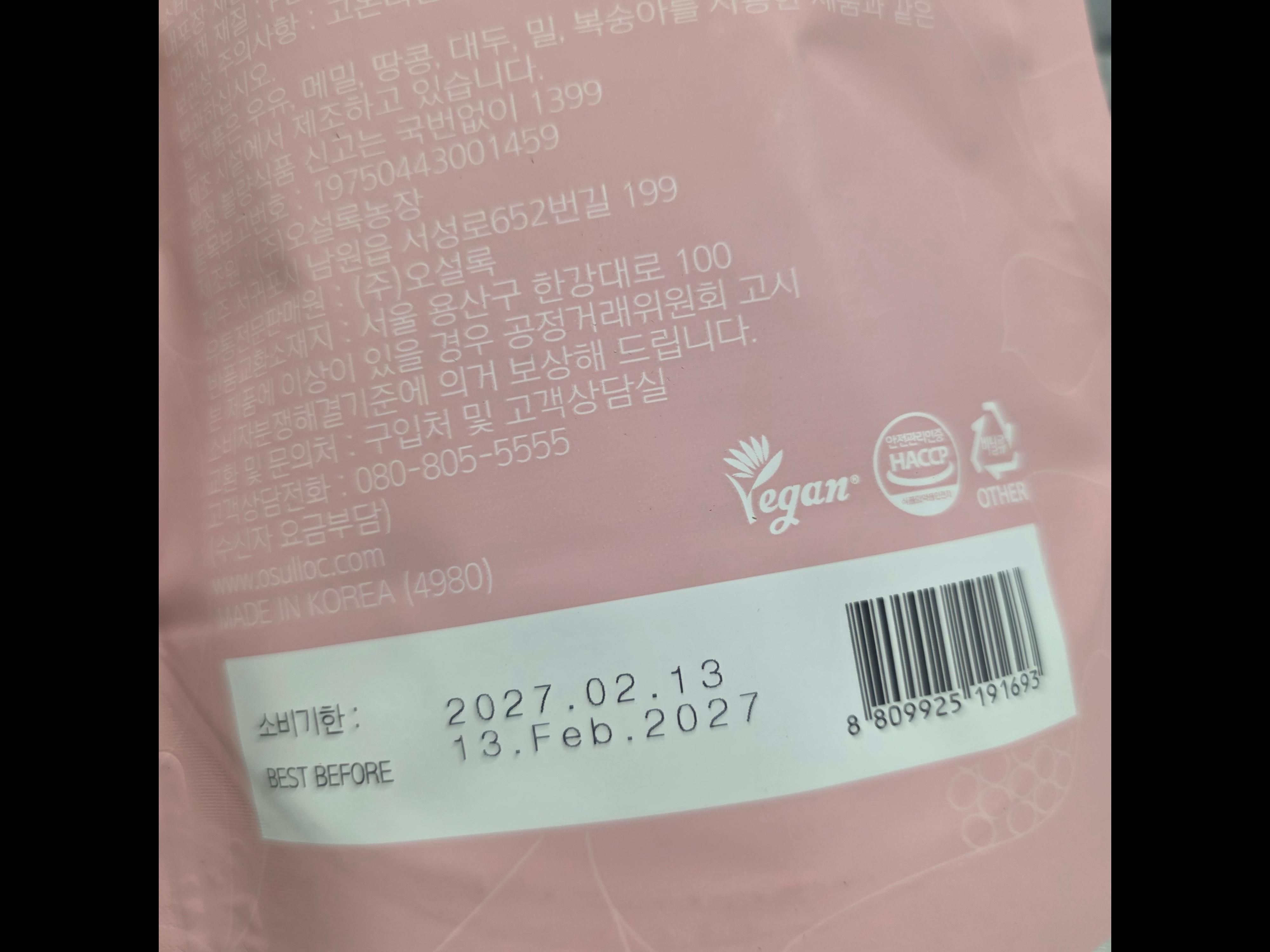 | 소비자안전을 위한 주의사항 | 본 제품은 우유, 메밀, 땅콩, 대두, 밀, 복숭아를 사용한 제품과 같은 제조 시설에서 제조하고 있습니다. | ||