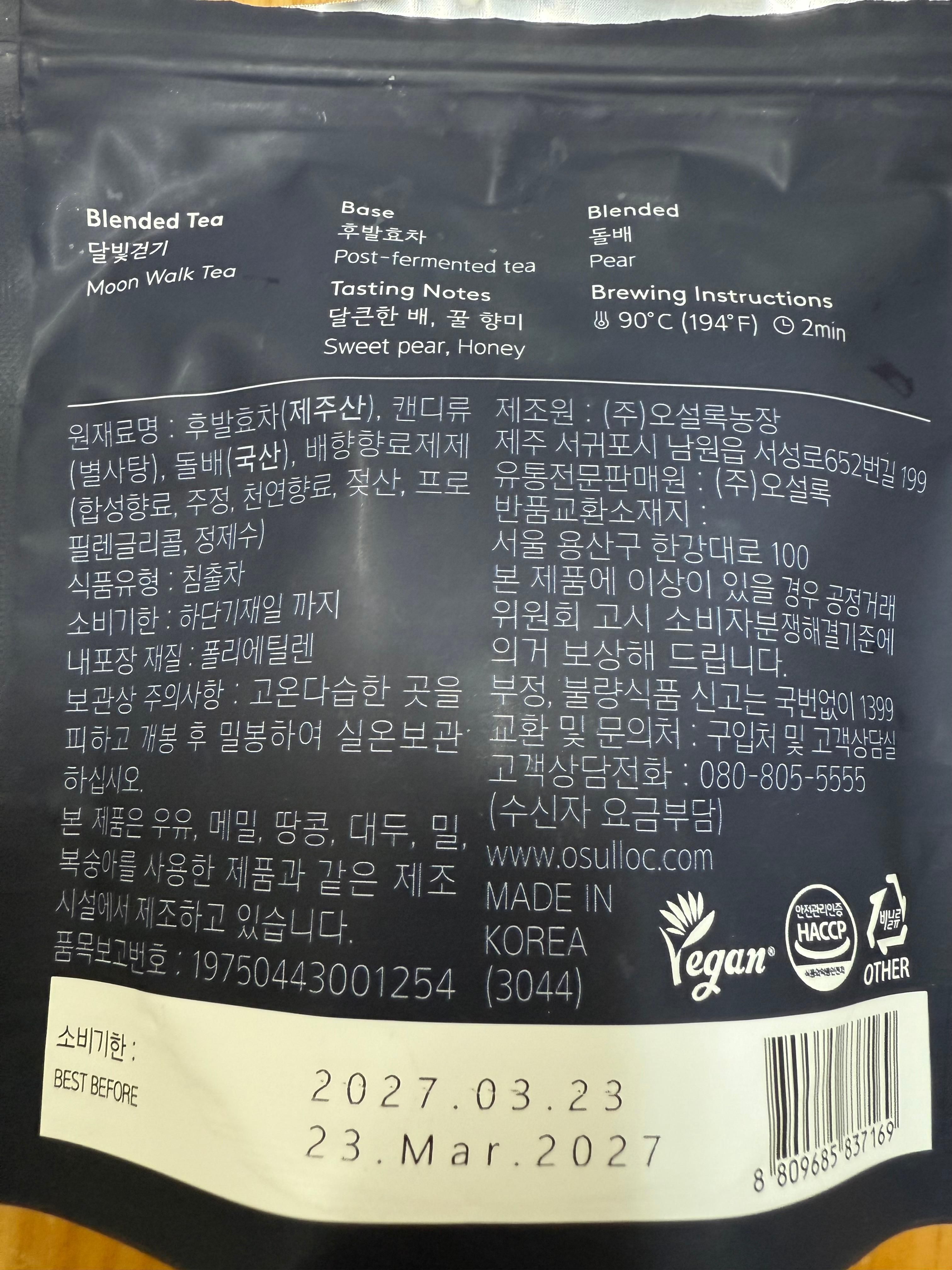| 원재료명 및 함량 | 후발효차(제주산), 캔디류(별사탕), 돌배(국산), 배향향료제제(합성향료, 주정, 천연향료, 젖산, 프로필렌글리콜, 정제수) | ||