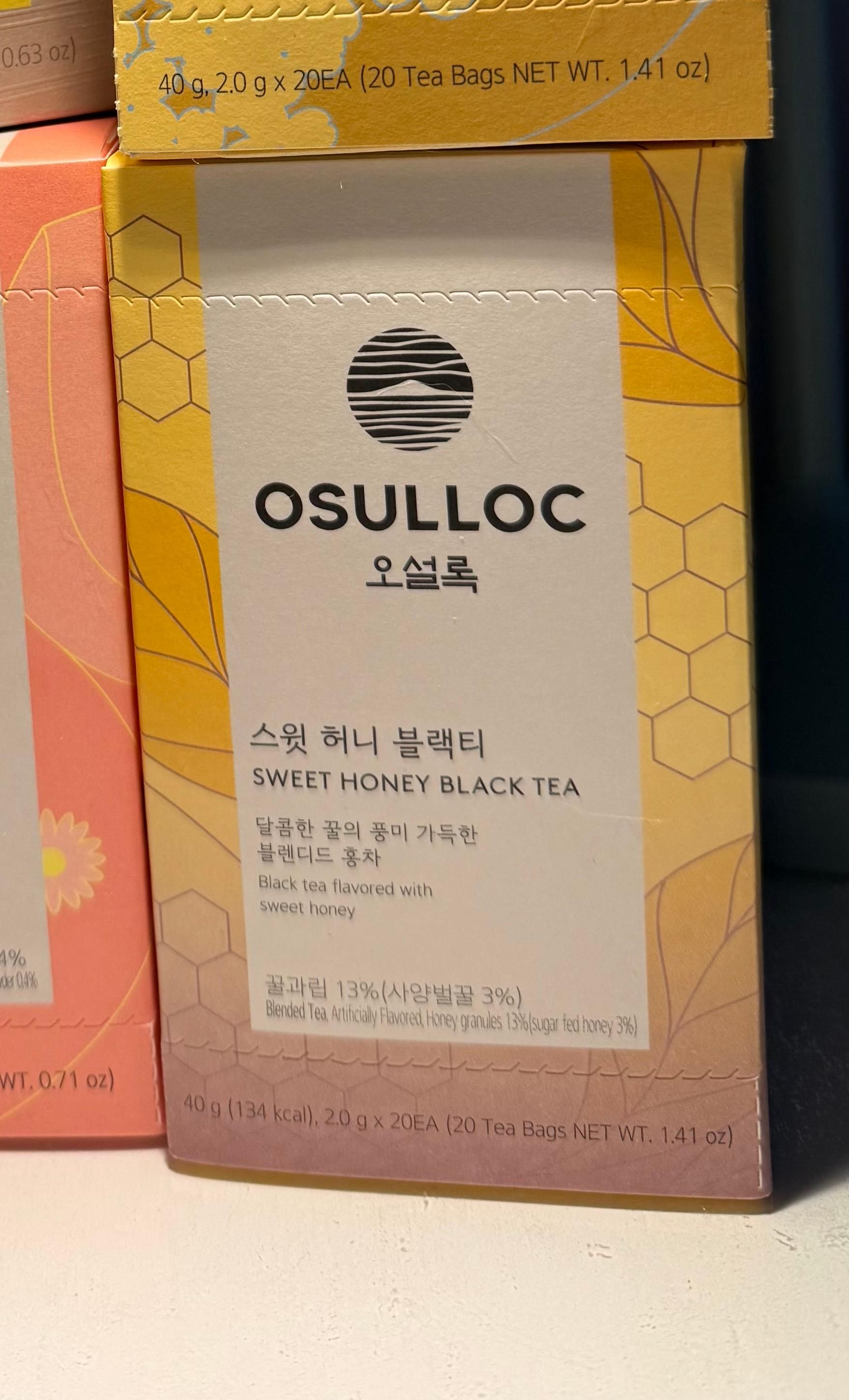 | 원재료명 및 함량 | 홍차(인도산 70.7%, 제주산29.3%), 꿀과립(포도당, 효소처리스테비아, 사양벌꿀(국산)), 후발효차(제주산), 향료(꿀향), 후발효차열수추출물, 스테비아잎 | ||