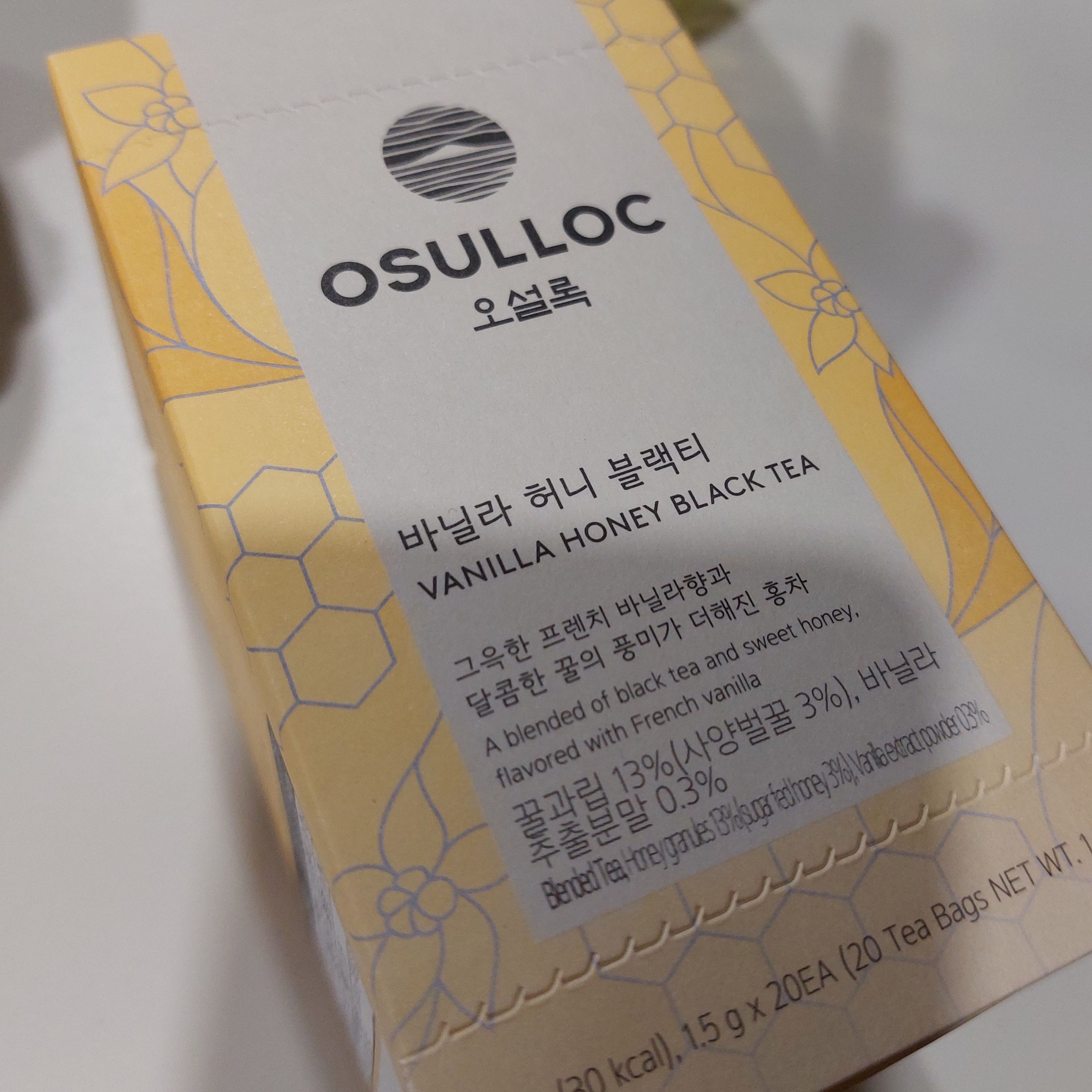| 원재료명 및 함량 | 홍차(인도산 83.7%, 제주산 16.3%), 후발효차(제주산), 꿀과립(포도당, 효소처리스테비아, 사양벌꿀(국산)), 향료(프렌치바닐라향), 후발효차열수추출물, 바닐라추출물(바닐라추출액(미국산)), 스테비아잎 | ||