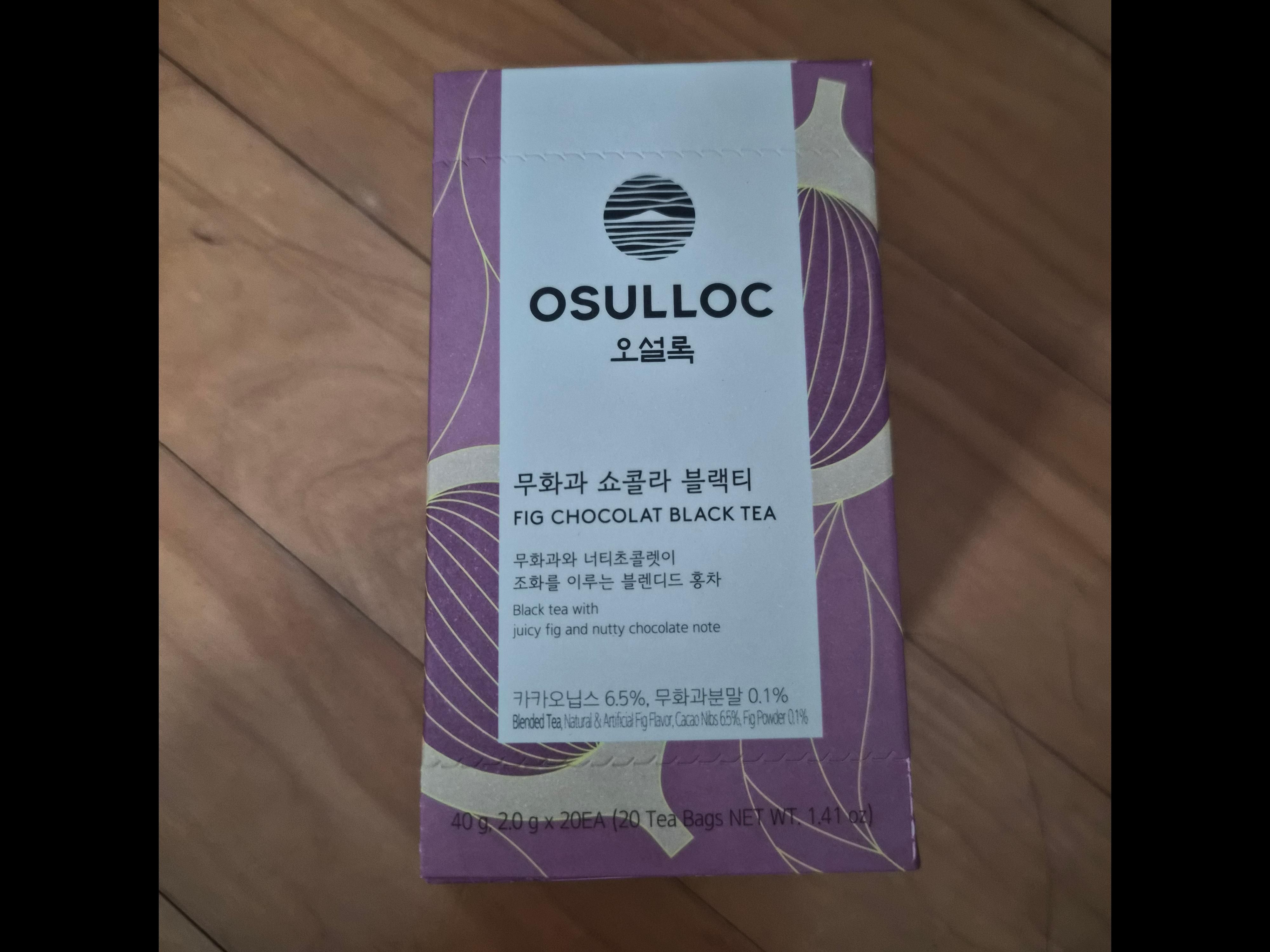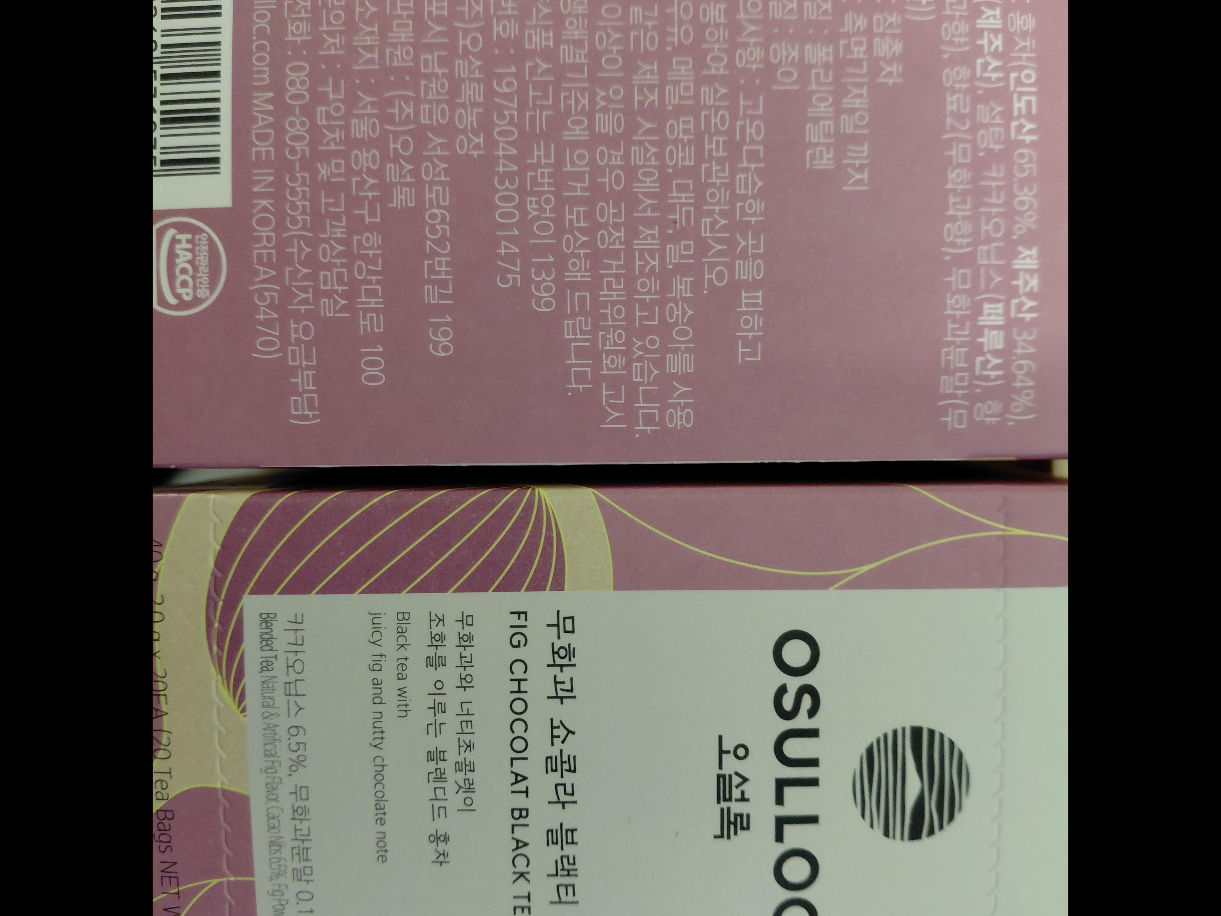 | 원재료명 및 함량 | 홍차(인도산 65.36%, 제주산 34.64%), 후발효차(제주산), 설탕, 카카오닙스(페루산), 향료1(무화과향), 향료2(무화과향), 무화과분말(무화과(국산)) | ||