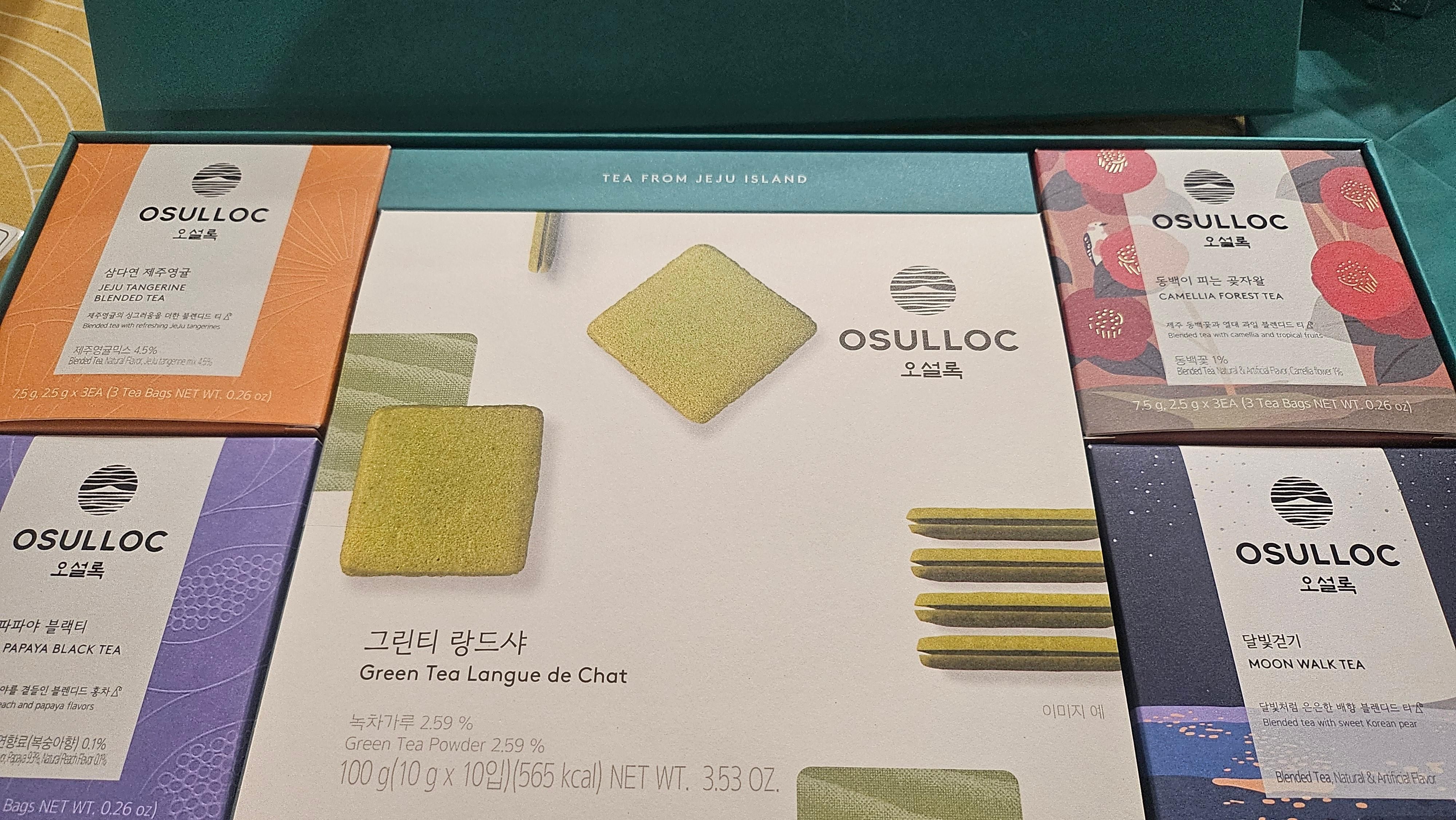 | 포장단위별 내용물의 용량(중량), 수량 | 오설록 달빛걷기 3입 : 7.5g(2.5gx3입) 오설록 피치 파파야 블랙티 3입: 7.5g(2.5gx3입) 오설록 삼다연 제주영귤 3입: 7.5g(2.5gx3입) 오설록 동백이 피는 곶자왈 3입 : 7.5g (2.5gx3입) 그린티 랑드샤 : 100g(10g X 10입) |