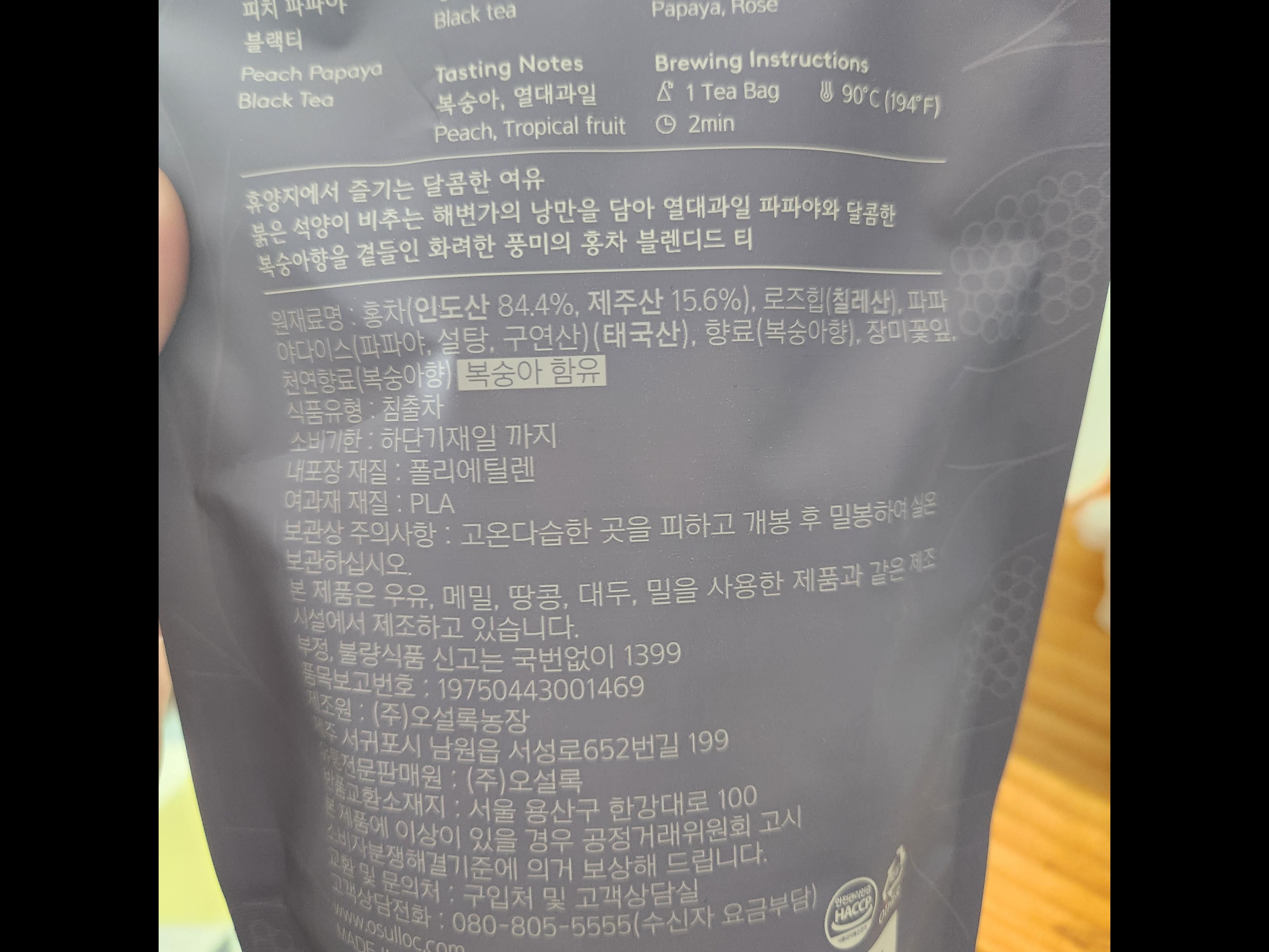| 원재료명 및 함량 | 홍차(인도산 84.4%, 제주산 15.6%), 로즈힙(칠레산), 파파야다이스(파파야, 설탕, 구연산)(태국산), 향료(복숭아향), 장미꽃잎, 천연향료(복숭아향) [복숭아 함유] | ||