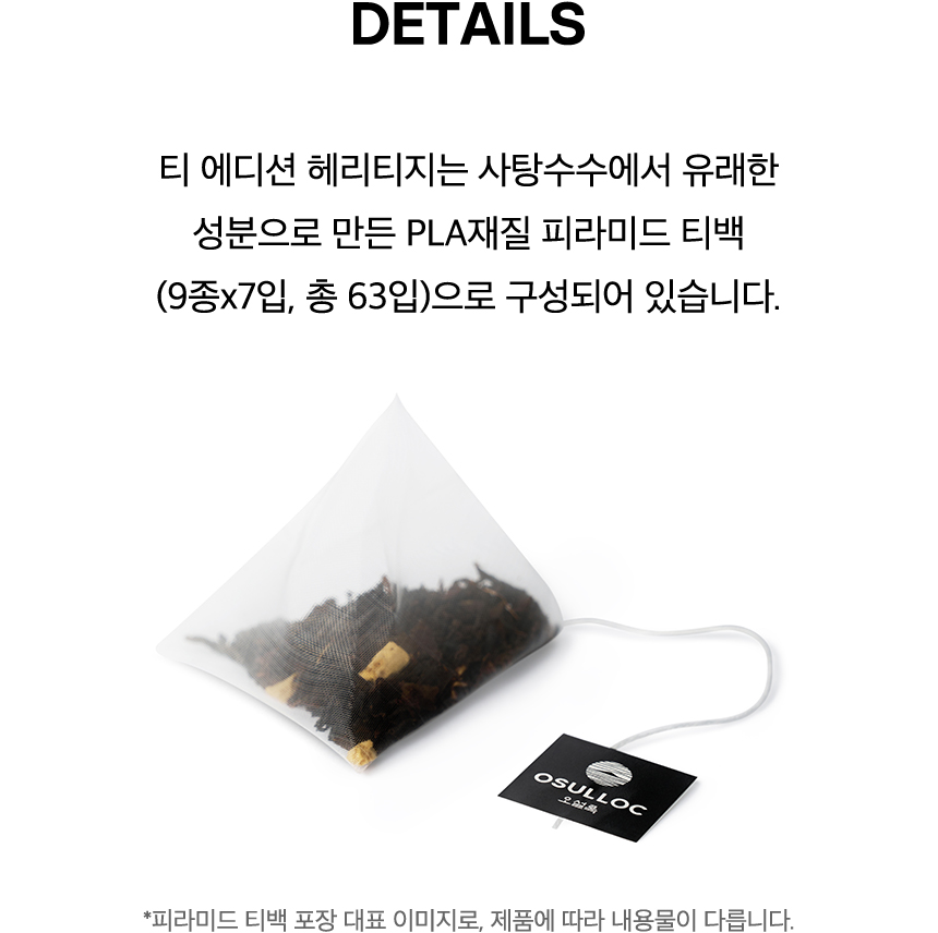 티 에디션 헤리티지는 사탕수수에서 유래한 성분으로 만든 PLA재질 피라미드 티백(9종 7입씩, 총 63입)으로 구성되어 있습니다.
