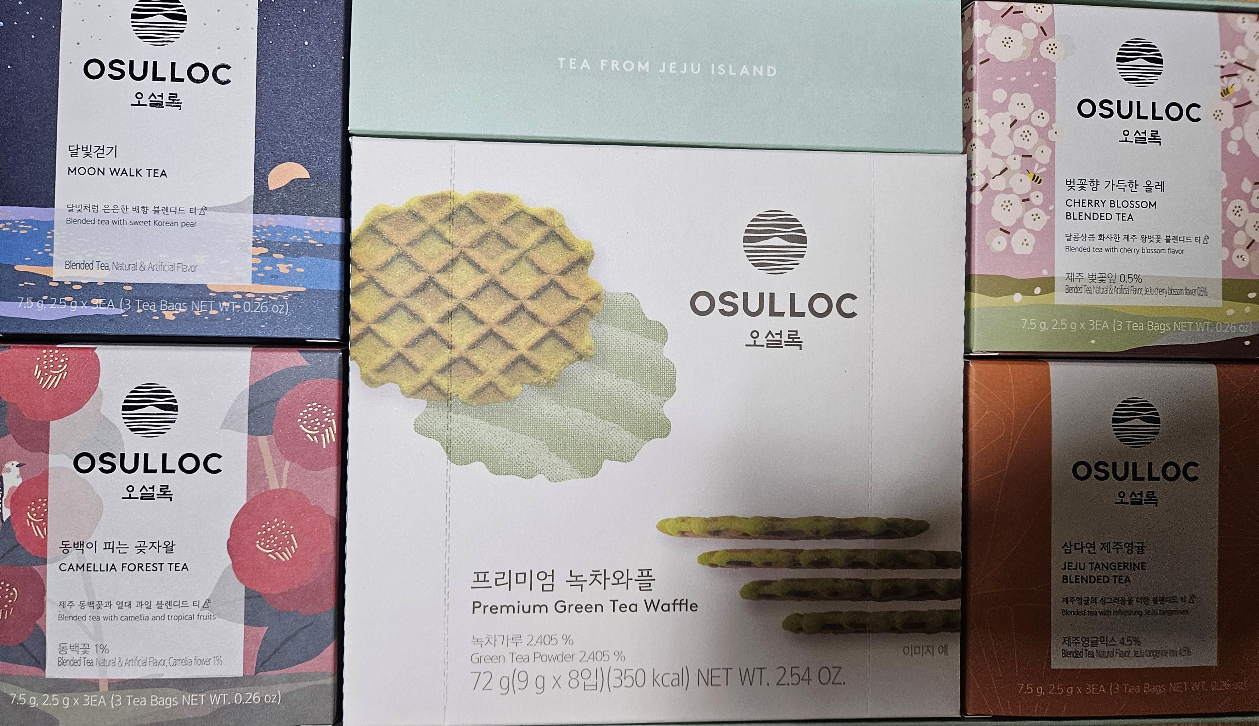 | 포장단위별 내용물의 용량(중량), 수량 | 오설록 피치 파파야 블랙티 3입 : 7.5g(2.5gx3입) 오설록 동백이 피는 곶자왈 3입 :7.5g(2.5gx3입) 오설록 달빛걷기 3입 : 7.5g(2.5gx3입) 오설록 삼다연 제주영귤 3입 : 7.5g(2.5gx3입) 프리미엄 녹차와플 : 72g |