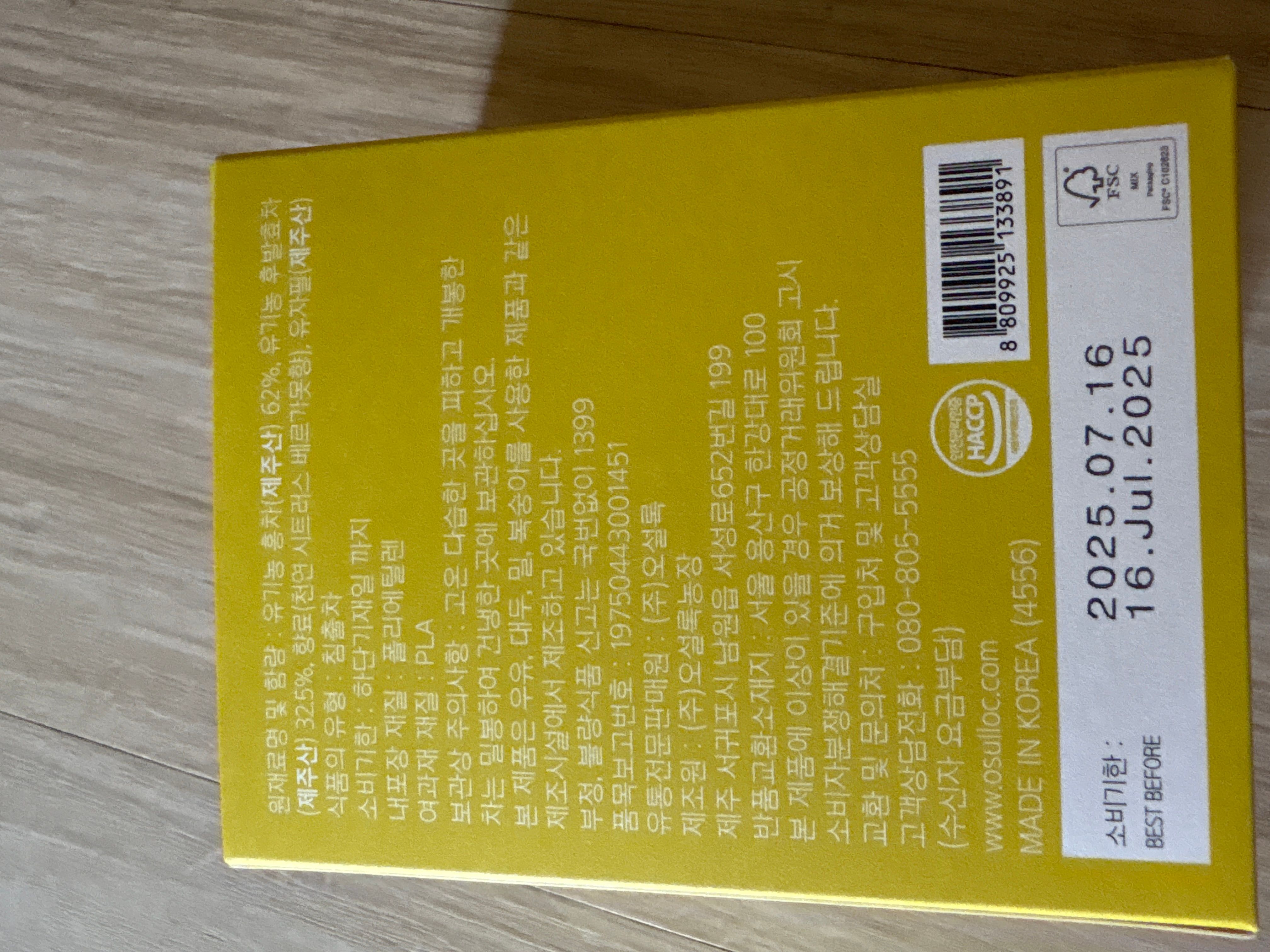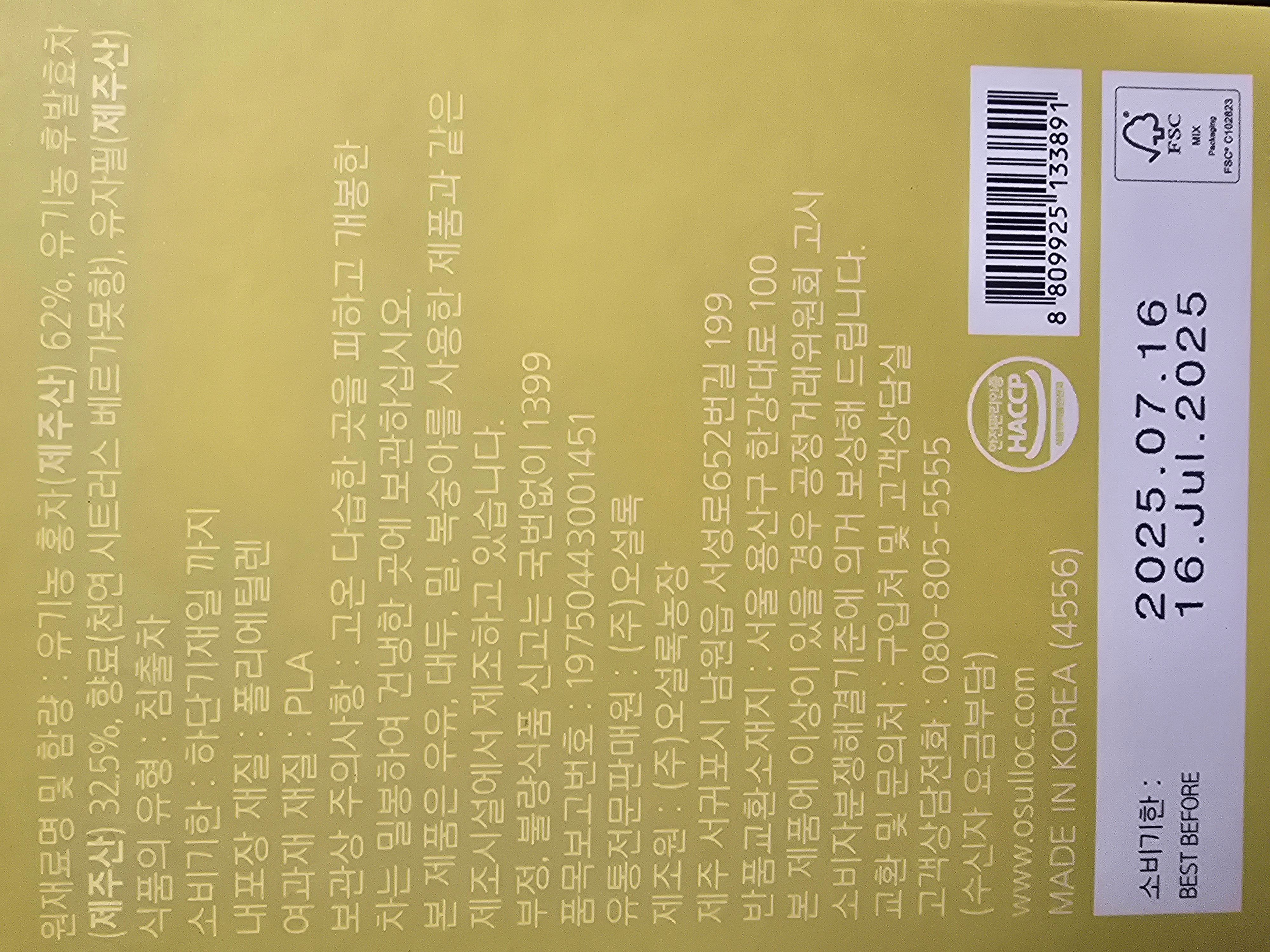 | 원재료명 및 함량 | 유기농 홍차(제주산) 62%, 유기농 후발효차(제주산) 32.5%, 향료(천연 시트러스 베르가못향), 유자필(제주산) | ||