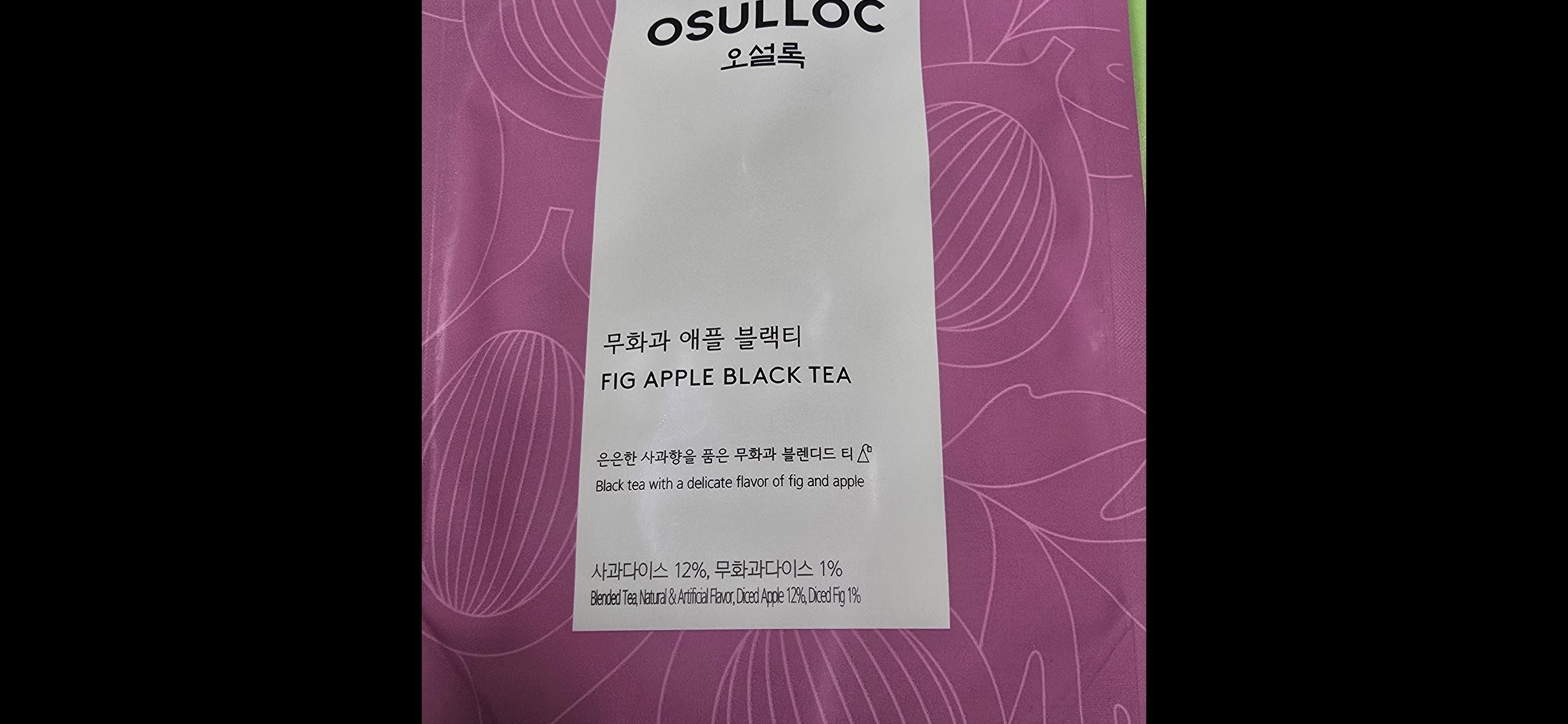 | 원재료명 및 함량 | 홍차(인도산 91.7%, 제주산 8.3%), 사과다이스 (튀르키예산), 카카오닙스(페루산), 로즈힙, 향료1(무화과향), 향료2(무화과향), 건조 무화과다이스(무화과:국산), 장미꽃잎 | ||