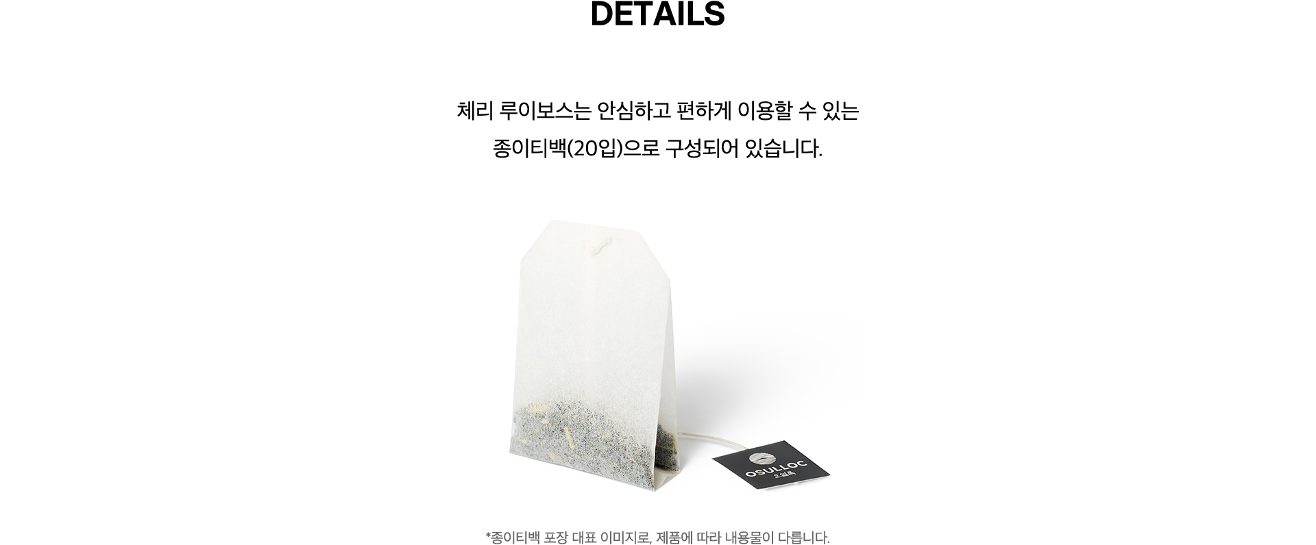 체리 루이보스는 안심하고 편하게 이용할 수 있는 종이티백(20입)으로 구성되어 있습니다.