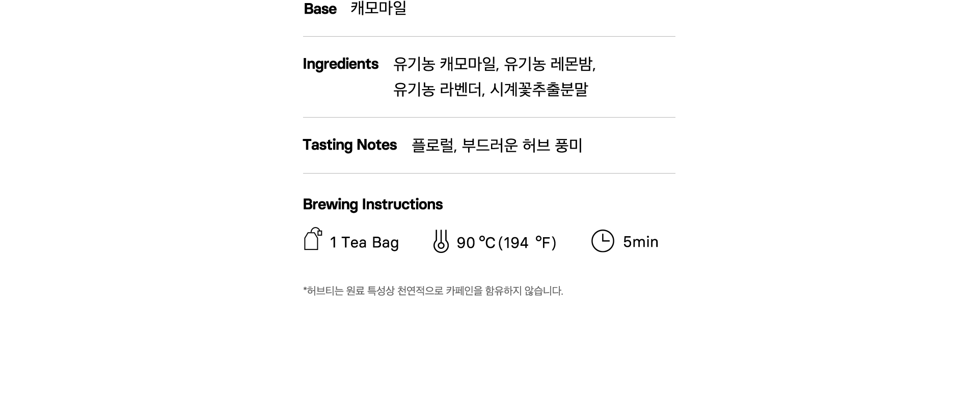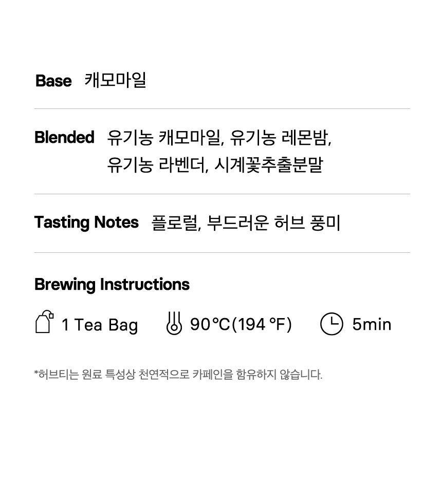이 제품은 캐모마일과 라벤더의 은은한 향과 체리 루이보스의 달콤한 향이 조화롭게 어우러져 향긋함을 선사합니다. 맛 또한 부드럽고 균형 잡혀 있으며, 건강에 좋은 무카페인 유기농 재료로 만들어져 아이들도 안심하고 마실 수 있습니다. 세련된 패키지 디자인과 높은 재구매 의사로 고객 만족도가 매우 높은 제품으로 평가됩니다.