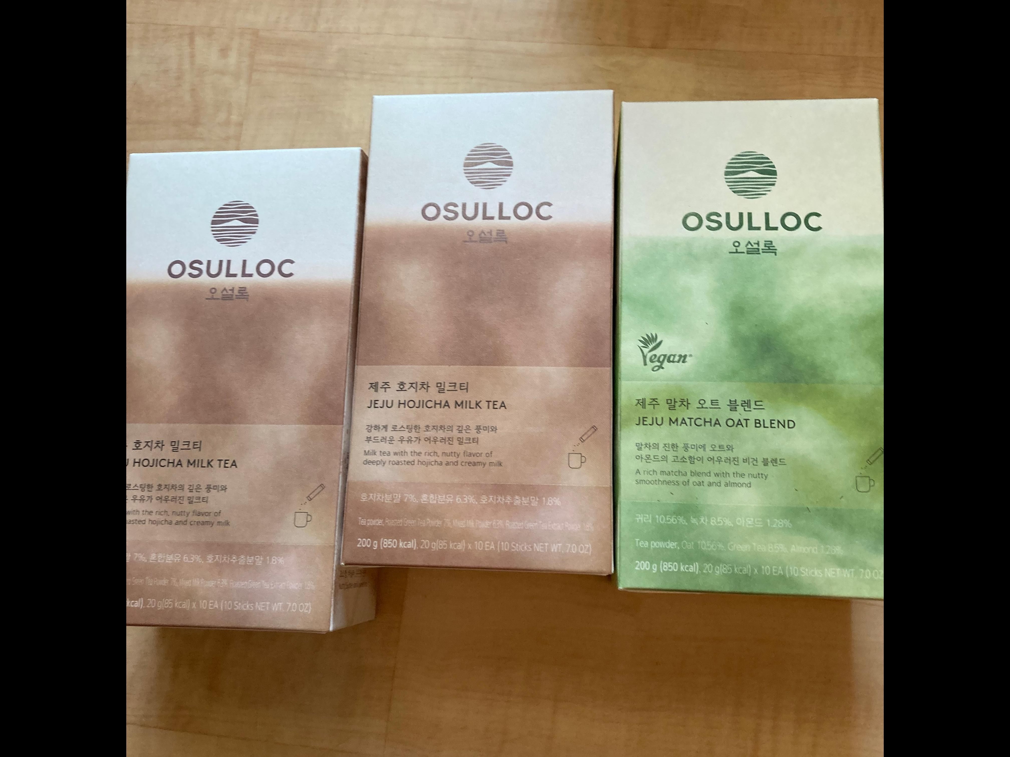 | 원재료명 및 함량 | 말차 오트 블렌드 : 원재료명:설탕, 식물성크림[물엿, 야자경화유{외국산(인도네시아, 필리핀, 말레이시아등)}, 제이인산칼륨, 스테아릴젖산나트륨, 글리세린디아세틸주석산지방산에스테르], 기타가공품[귀리(캐나다산), 대두(국산), 코코넛분말, 아몬드],녹차(제주산), 이산화규소, 정제소금 [대두함유] 제주 호지차 밀크티 : 크림베이스[설탕, 가공유크림{유크림(이탈리아산)}, 식물성크림1{식물성경화유지(외국산:인도네시아, 필리핀, 말레이시아 등)}, 식물성크림2, 혼합분유, 식물성크림3], 호지차분말(제주산), 호지차추출분말{식물성추출액(호지차:국산)}, 천연향료(바닐라향분말),정제소금 [우유, 대두 함유] |