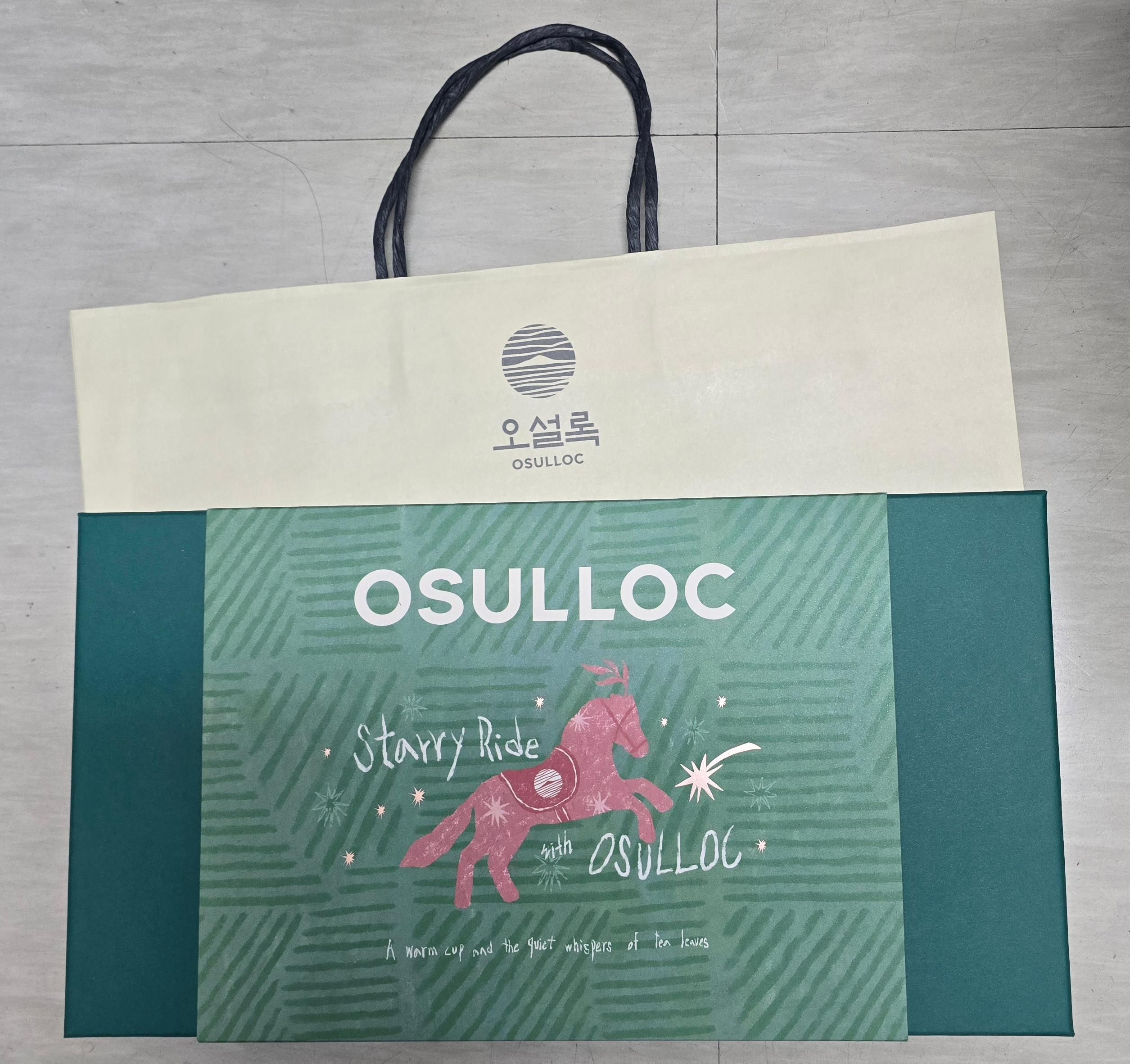 | 포장단위별 내용물의 용량(중량), 수량 | 오설록 달빛걷기 3입 : 7.5g(2.5gx3입) 오설록 피치 파파야 블랙티 3입: 7.5g(2.5gx3입) 오설록 삼다연 제주영귤 3입: 7.5g(2.5gx3입) 오설록 동백이 피는 곶자왈 3입 : 7.5g (2.5gx3입) 그린티 랑드샤 : 100g(10g X 10입) |