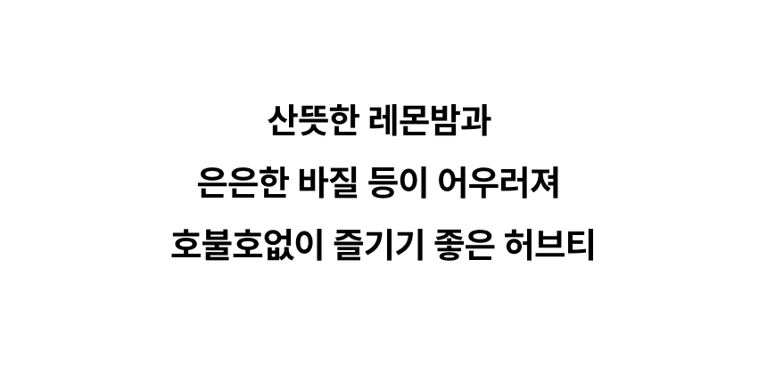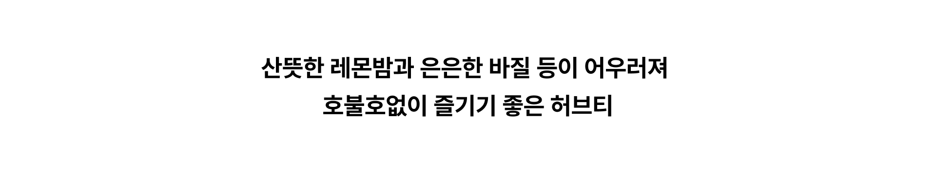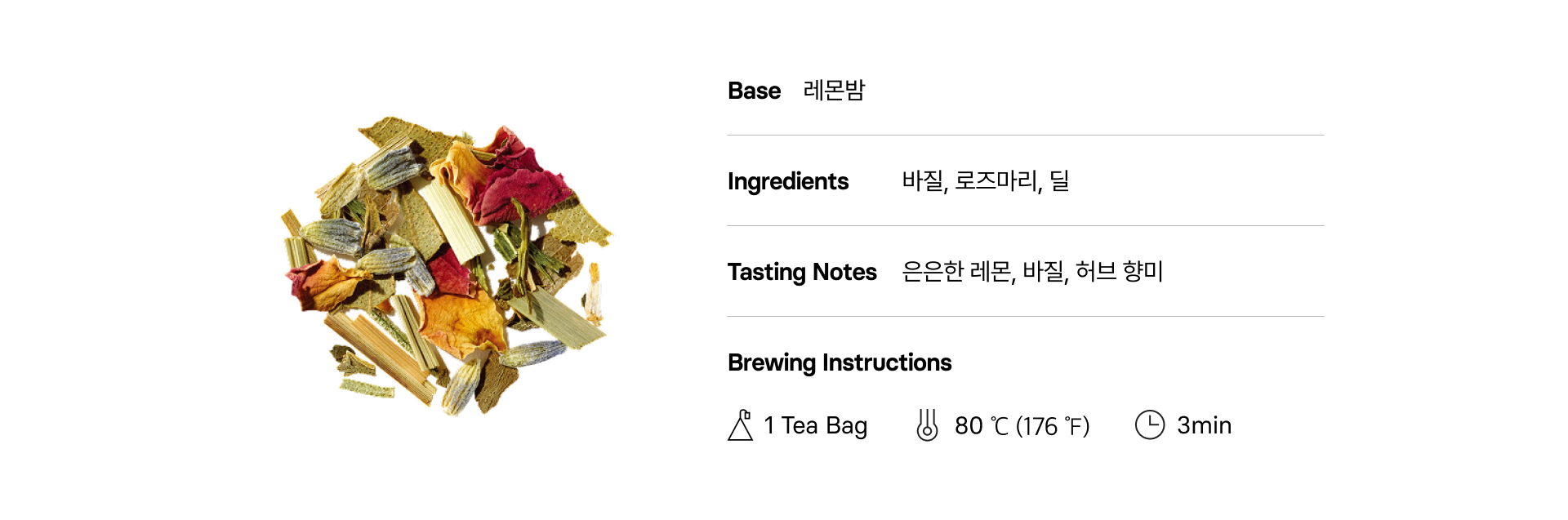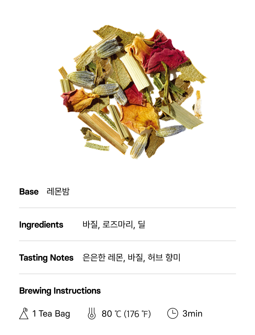 - 산뜻한 레몬밤과 은은한 바질 등이 어우러져 호불호없이 즐기기 좋은 허브티