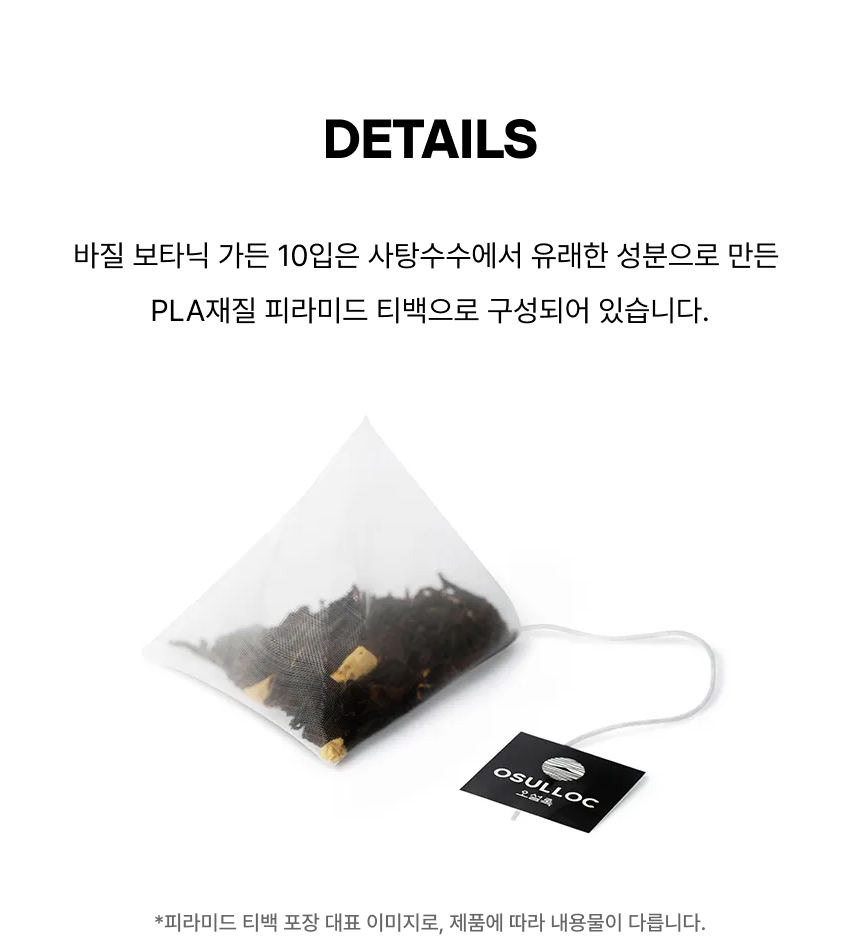 바질 보타닉 가든 10입은 사탕수수에서 유래한 성분으로 만든 PLA재질 피라미드 티백으로 구성되어 있습니다.