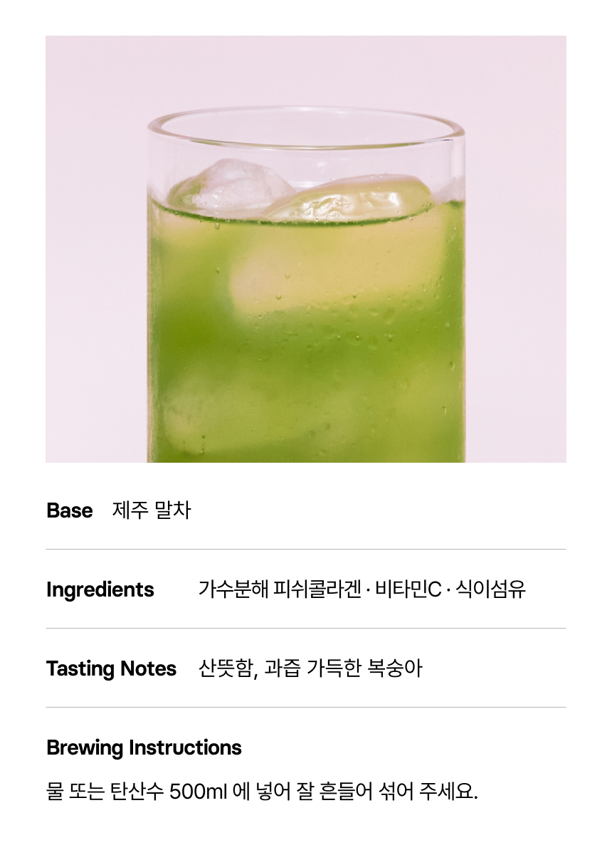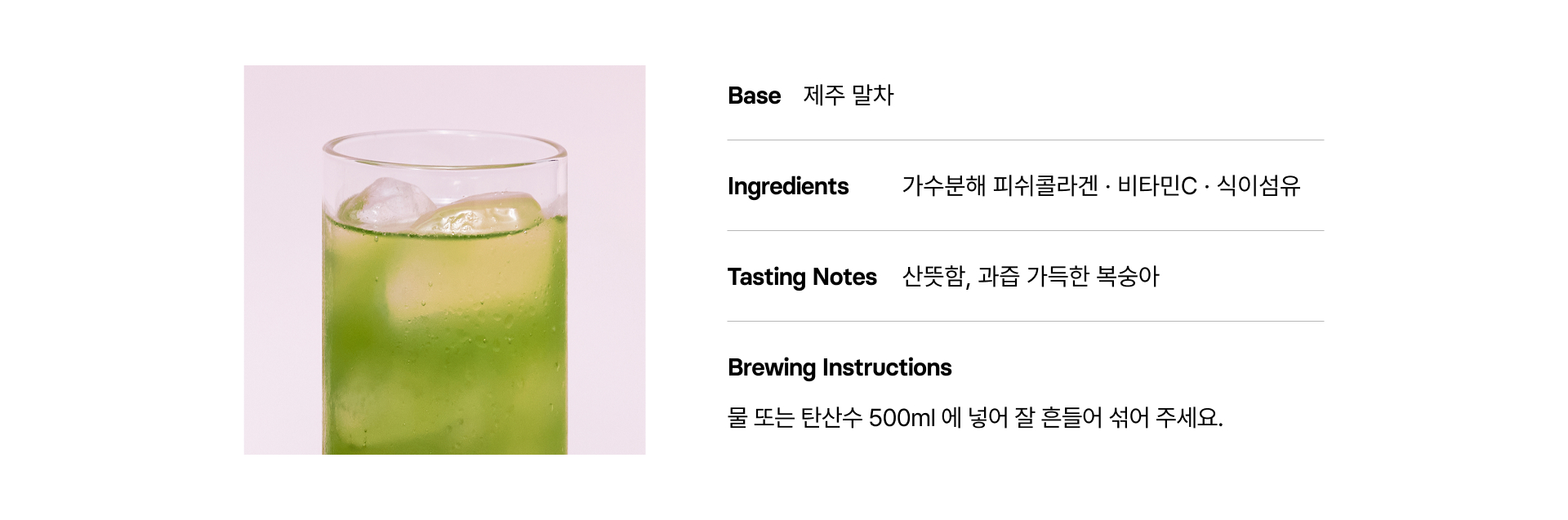 말차에 산뜻한 복숭아와 딸기 천연 과일향을 더해 부담없이 즐기기 좋은 웰니스 말차
