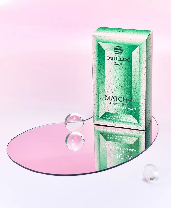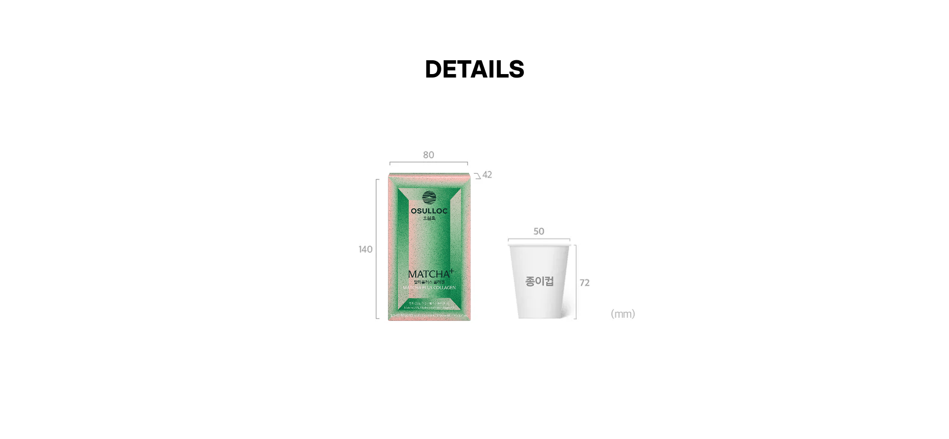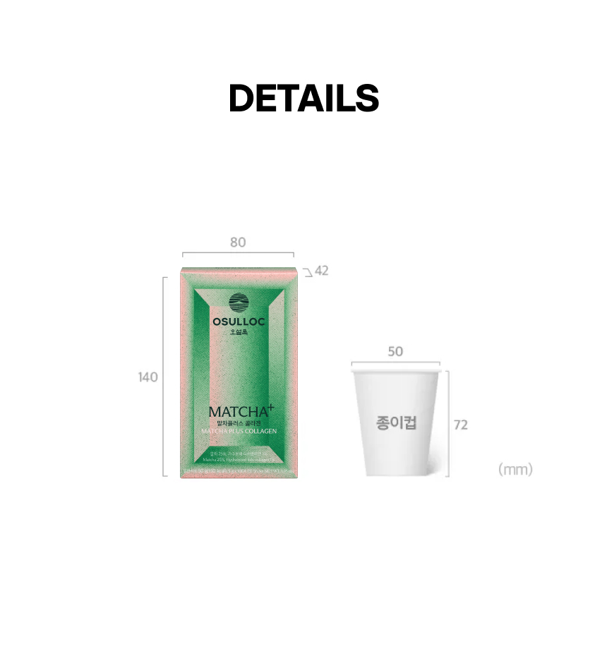 말차플러스 콜라겐은 가로 80mm, 세로 42mm, 높이 140mm의 종이 상자로 포장되어 있습니다.