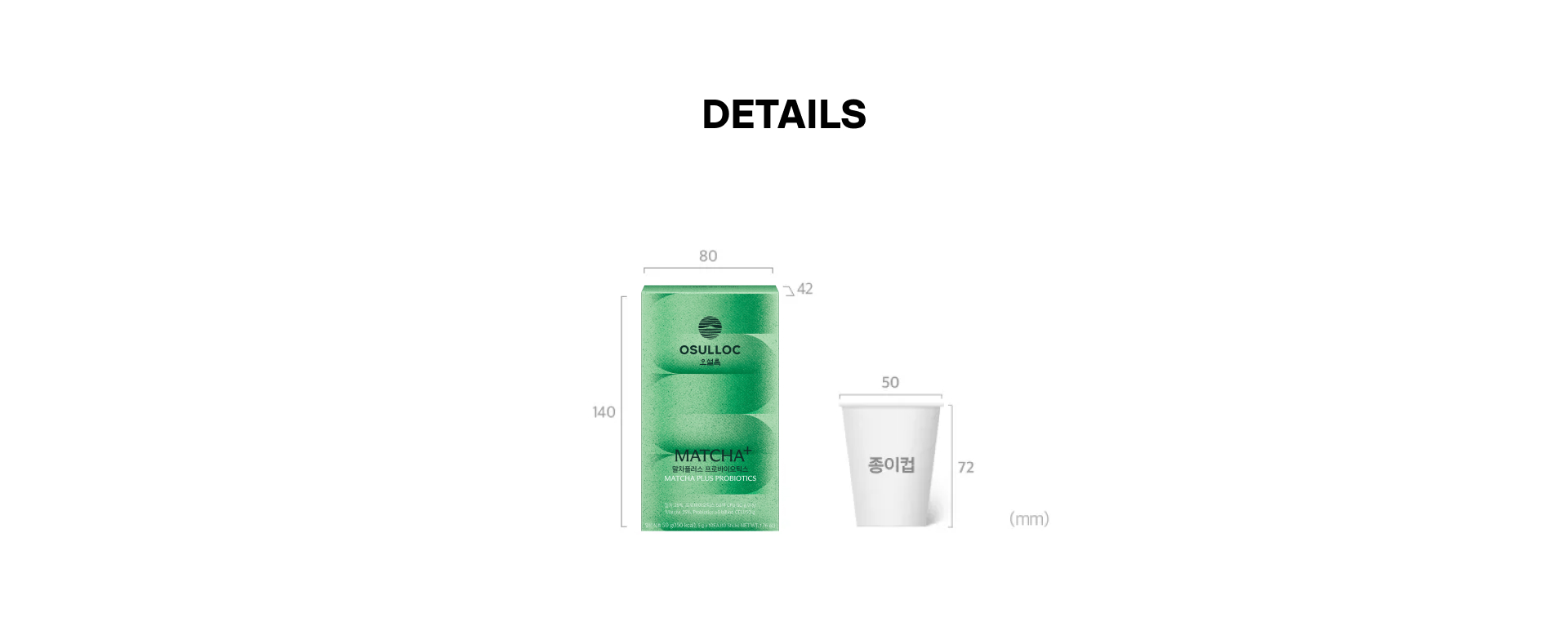 말차플러스 프로바이오틱스는 가로 80mm, 세로 42mm, 높이 140mm의 종이 상자로 포장되어 있습니다.