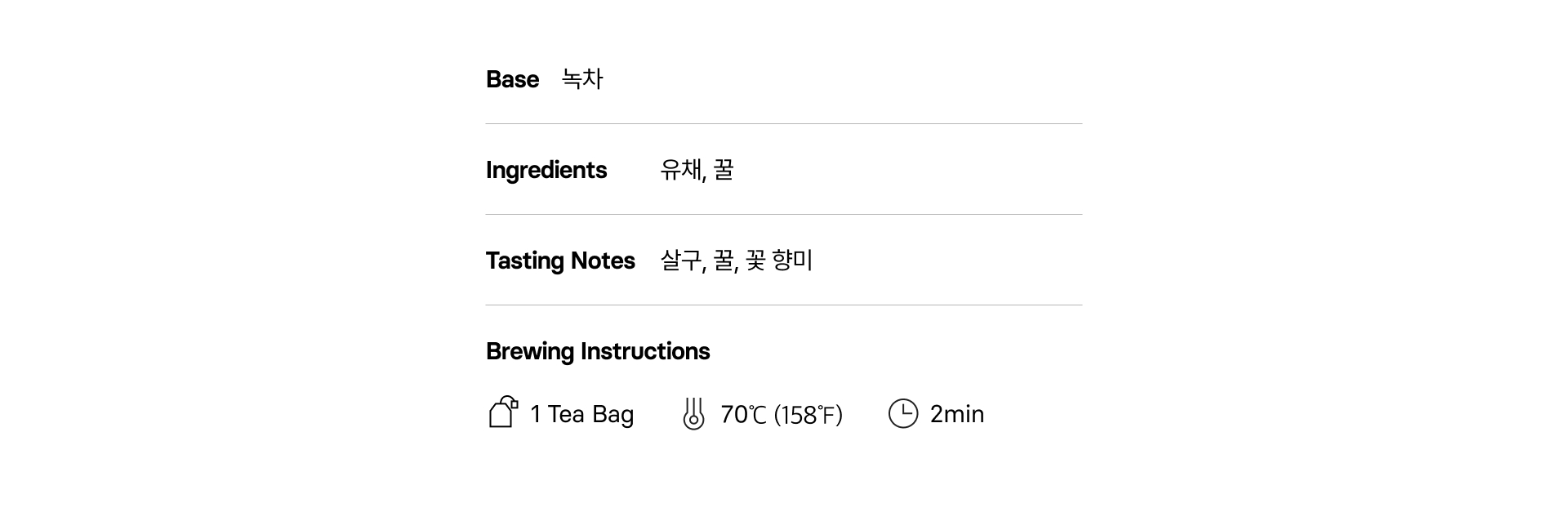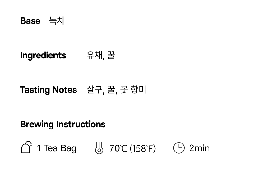 - Brewing Instructions : 티백 1개를 70도씨(158화씨)의 물에 2분간 우려 드세요.
