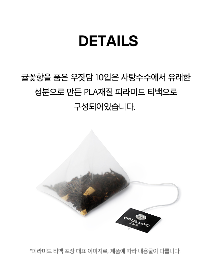 귤꽃향을 품은 우잣담 10입은 사탕수수에서 유래한 성분으로 만든 PLA재질 피라미드 티백으로 구성되어 있습니다.