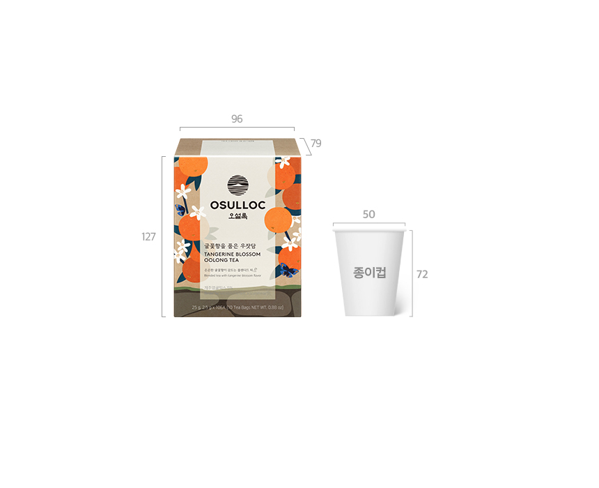 귤꽃향을 품은 우잣담 10입은 가로 96mm, 세로 79mm, 높이 127mm의 종이 상자로 포장되어 있습니다.